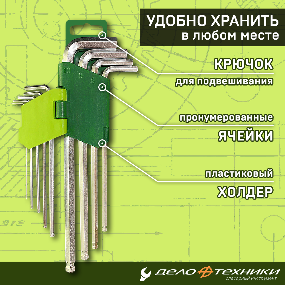 Набор ключей шестигранных с шаром удлинённых (1.5,2,2.5,3,4,5,6,8,10 мм) 9 шт. Дело Техники 562092