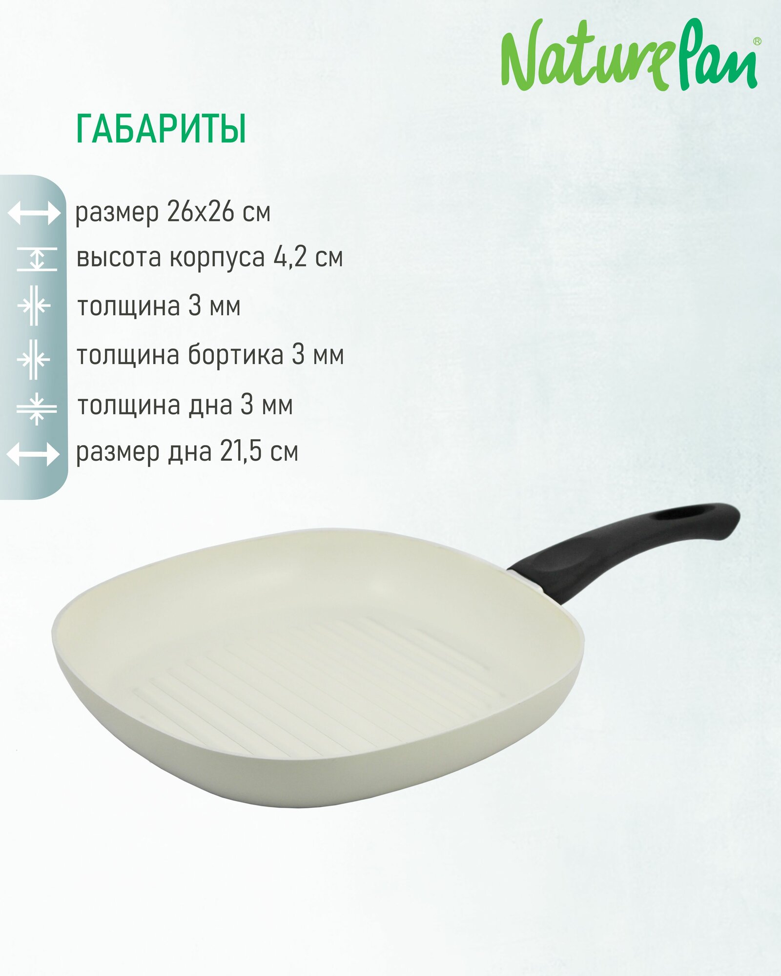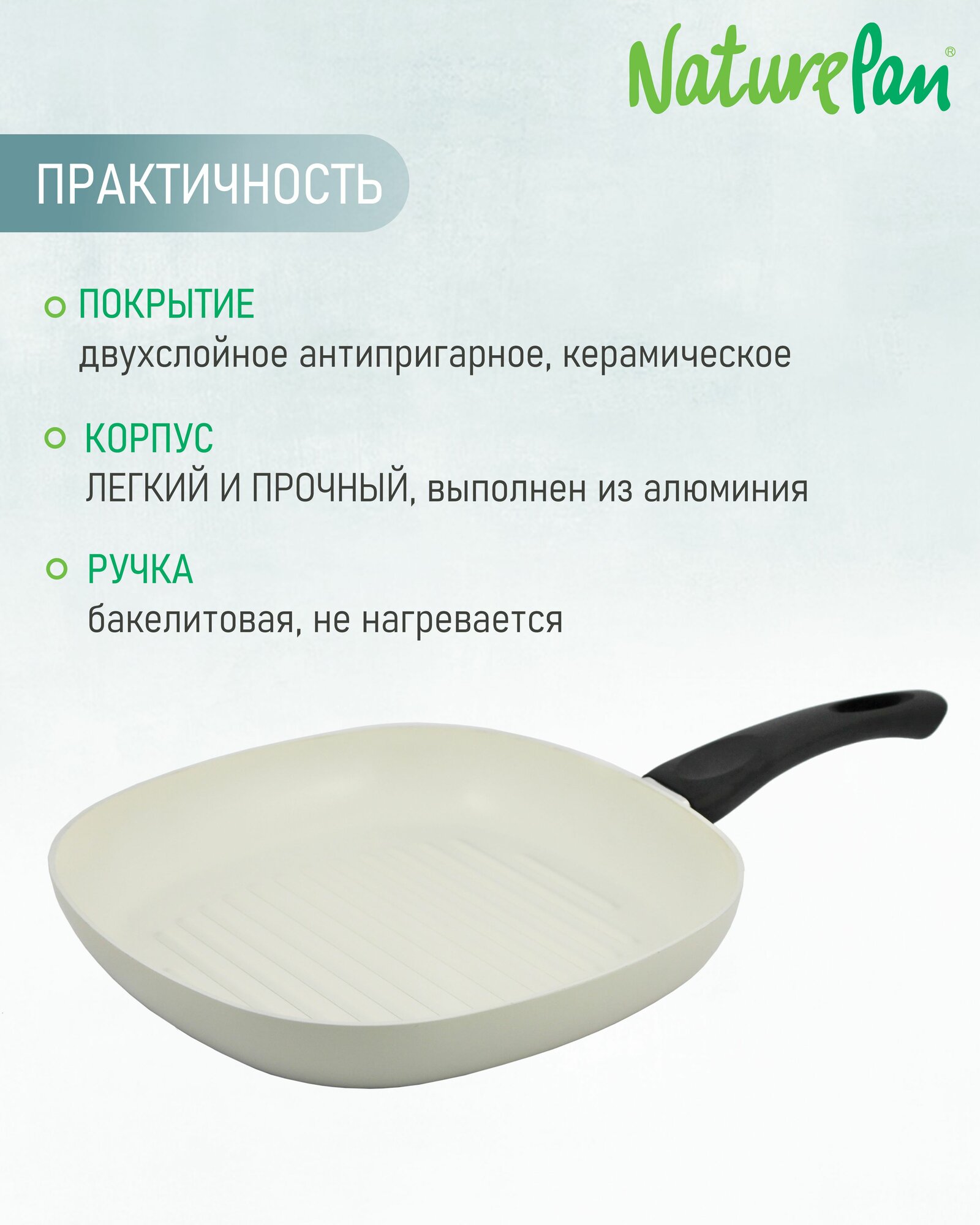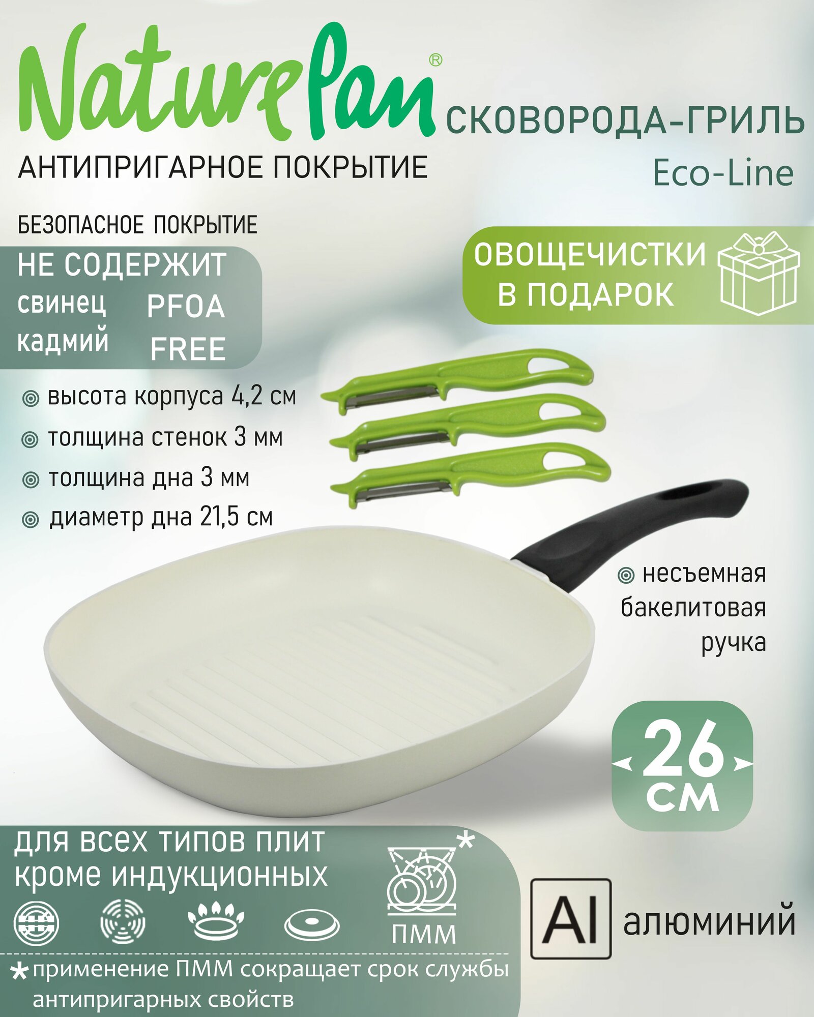 Сковорода-гриль квадратная 26х26см, с антипригарным керамическим покрытием, овощечистки в подарок, NaturePan Еco-Line интересное: