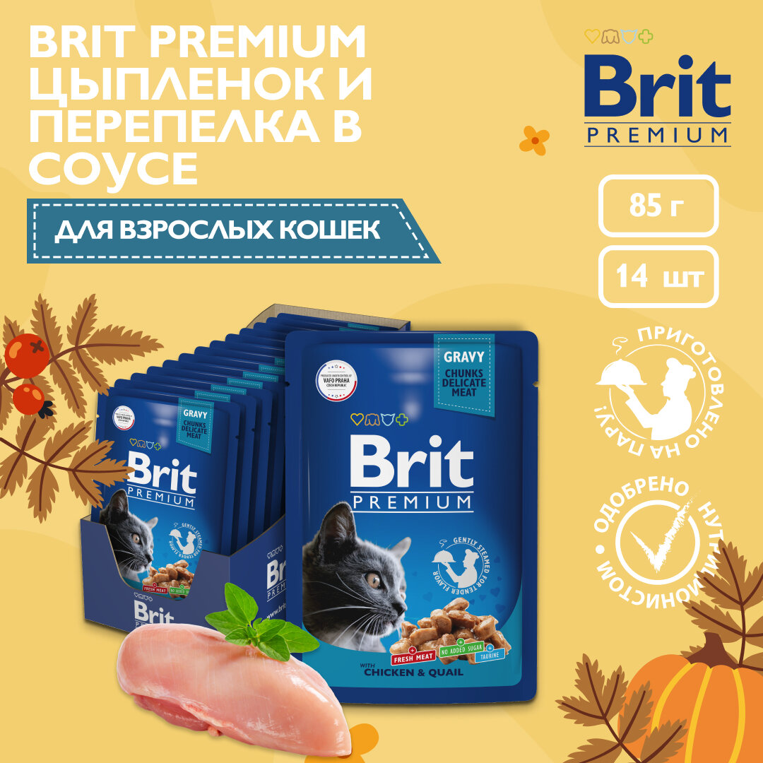 Корм Brit Premium Chicken & Quail (в соусе) для кошек, цыпленок и перепелка, 85 г x 14 шт