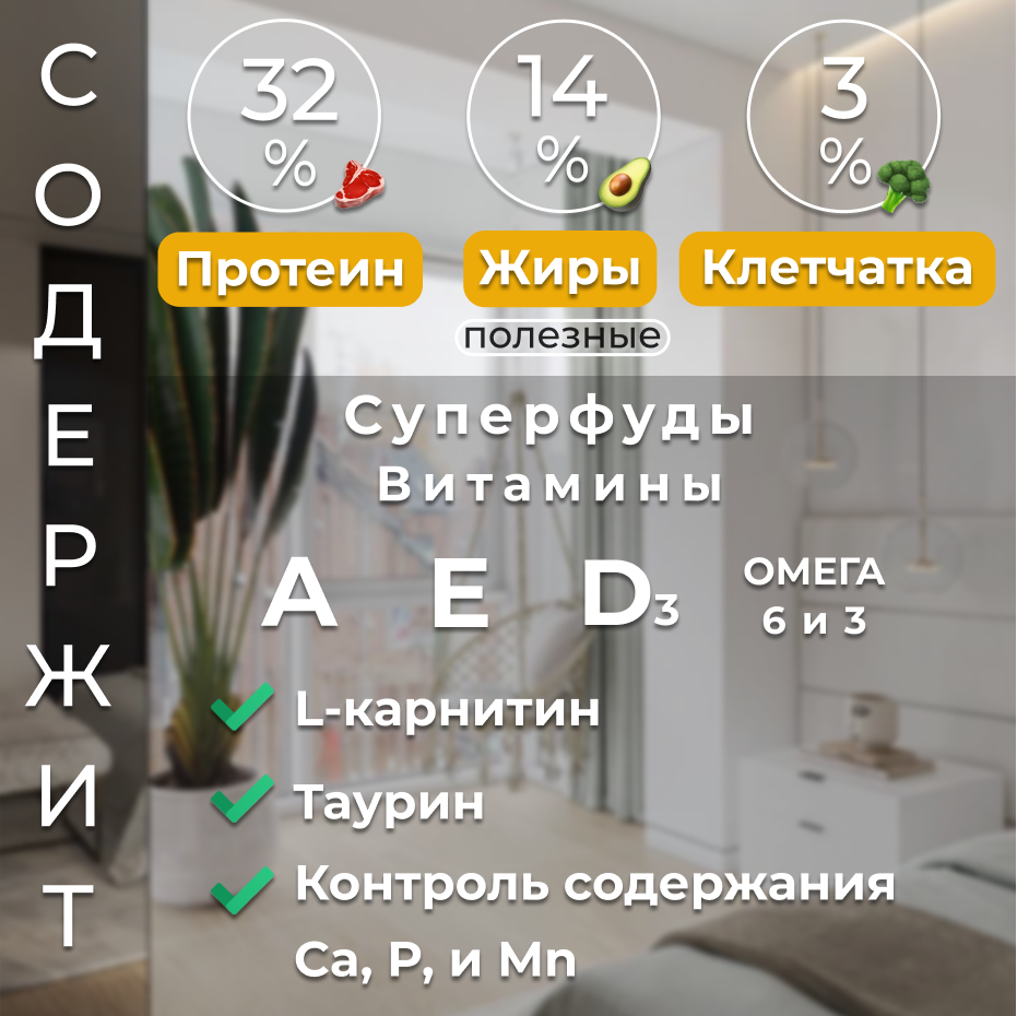 | Дополнительная информация | не содержит: кукурузу, пшеницу, свеклу, горох, субпродукты, яйца, курицу, куриный жир, соль, сахар, красители, ароматизаторы, сою и гмо |