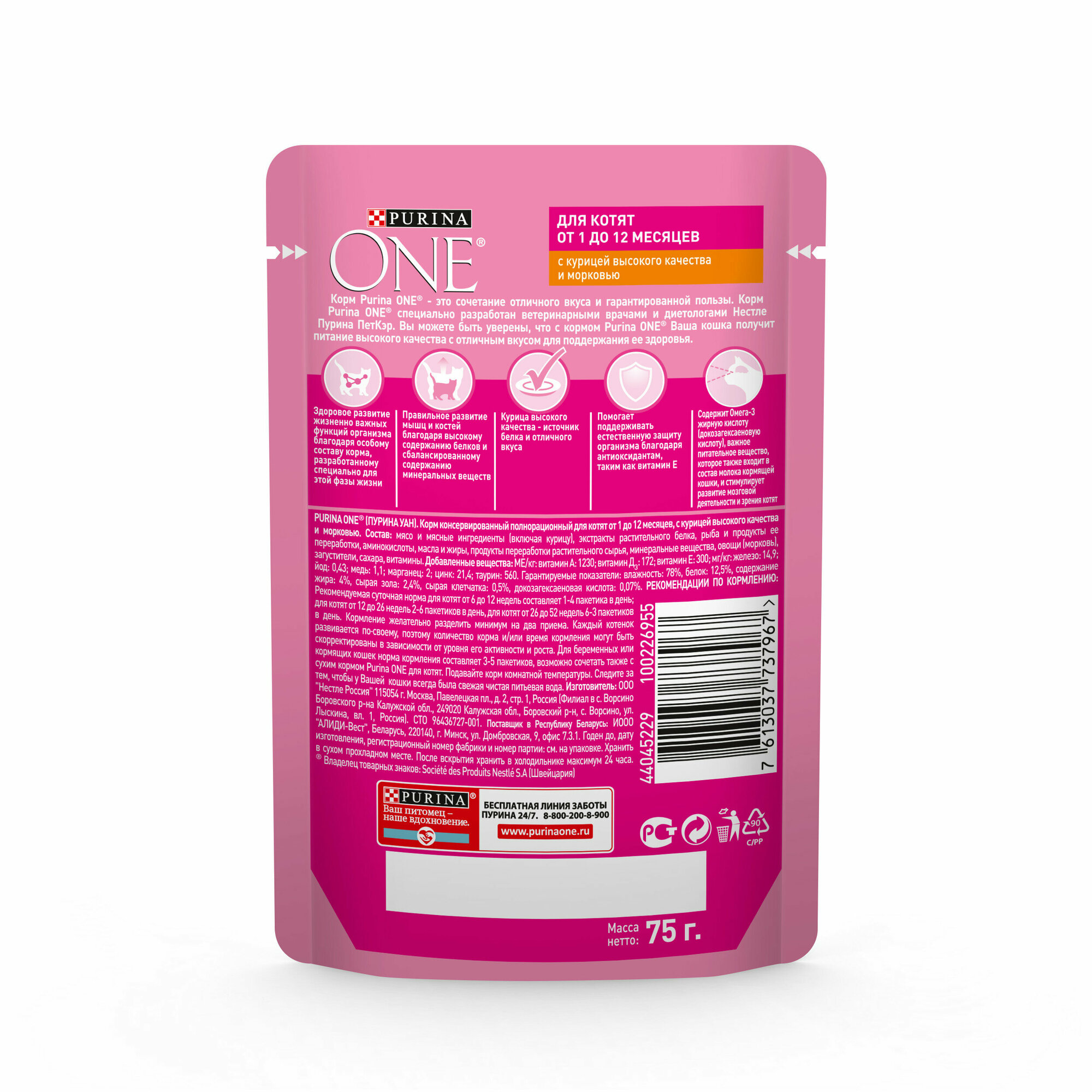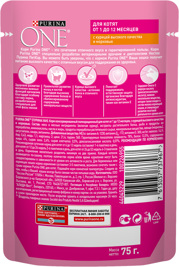 Влажный корм Purina One для котят, курица с морковью, пауч, 75 г*26 шт