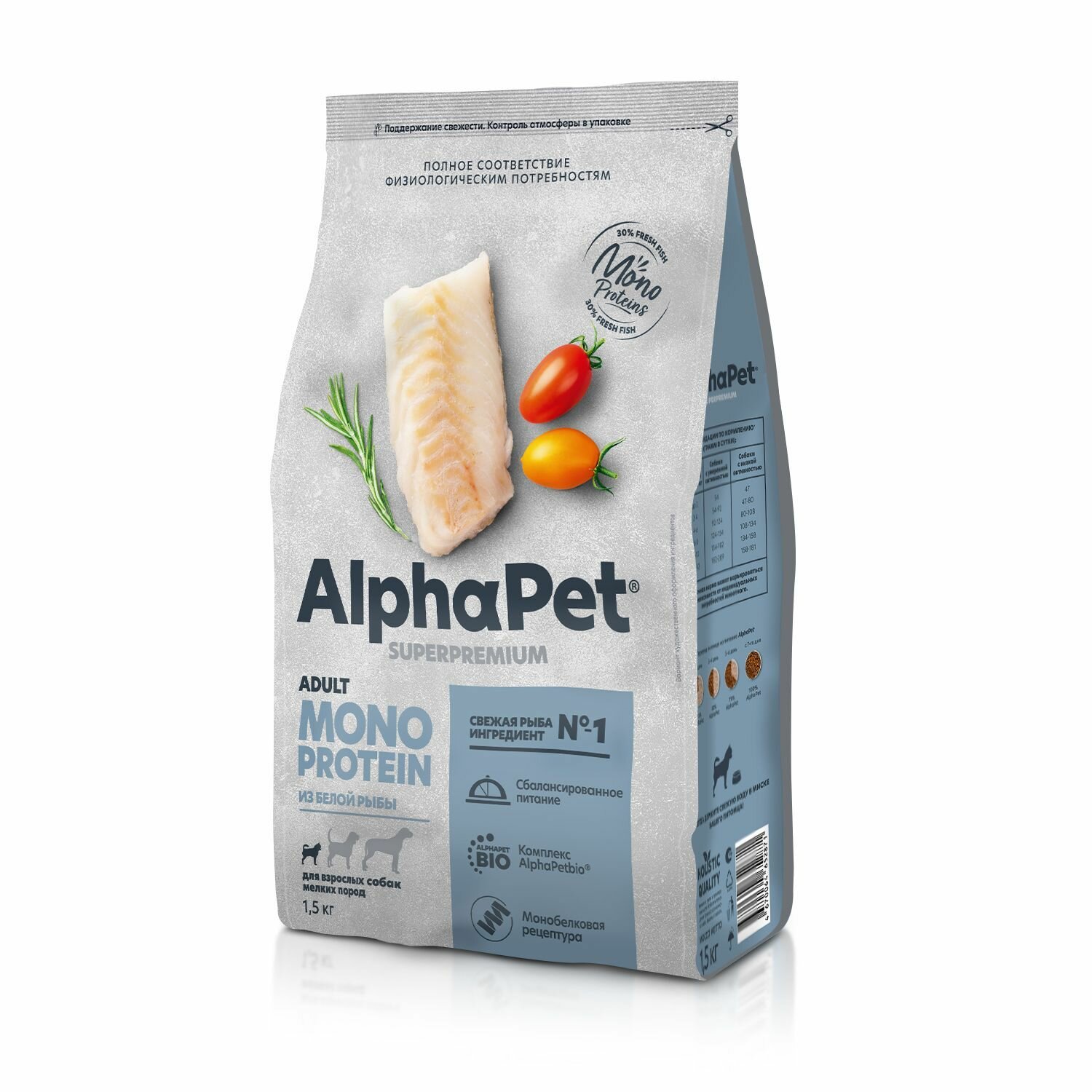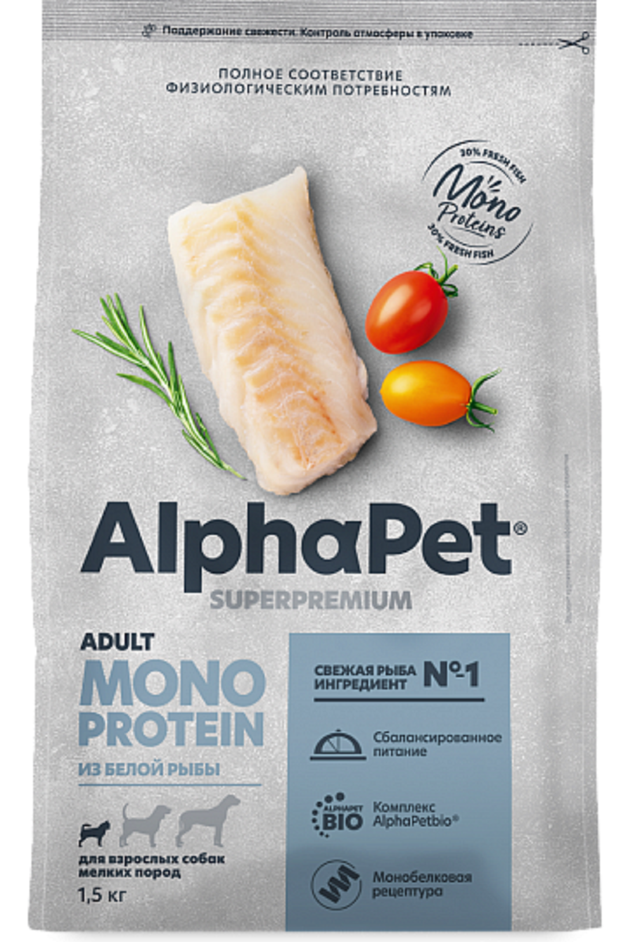 Купить ALPHAPET SUPERPREMIUM MONOPROTEIN монобелковый для взрослых собак маленьких пород с белой рыбой NEW 1,5 кг