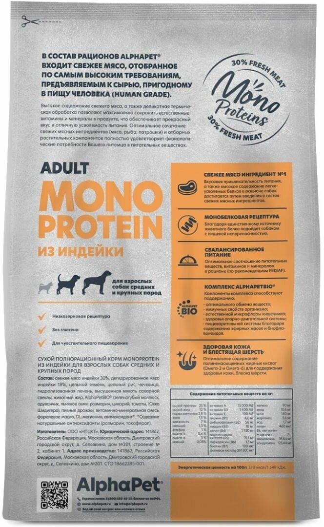 Купить AlphaPet Superpremium Monoprotein сухой корм для взрослых собак средних и крупных пород с индейкой - 2 кг