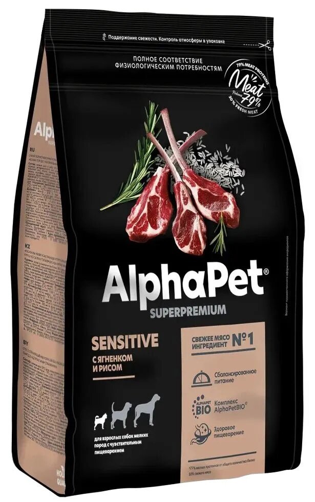 Корм для собак сухой АльфаПет Superpremium Sensitive для взрослых животных мелких пород с чувствительным пищеварением, гранулы с ягненком и рисом