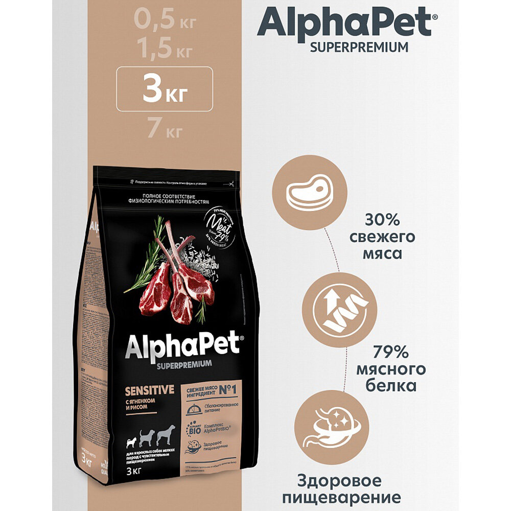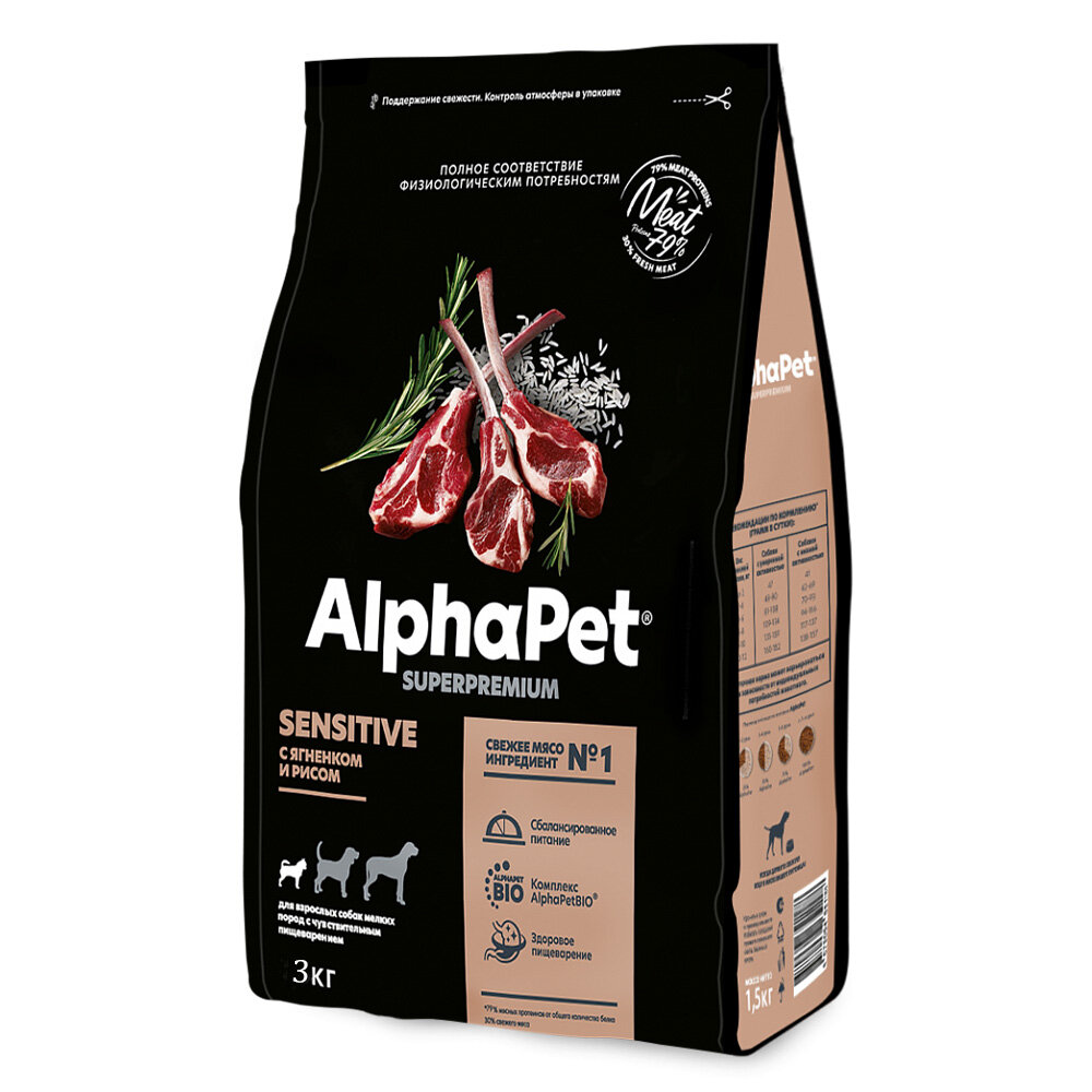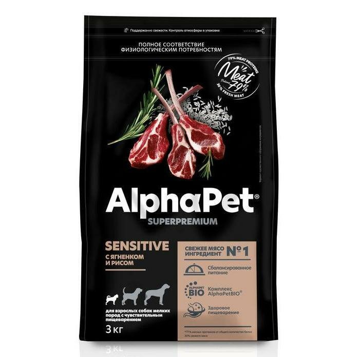 AlphaPet Superpremium 1шт -3кг с ягненком и рисом сухой для собак мелких пород с чувствительным пищеварением