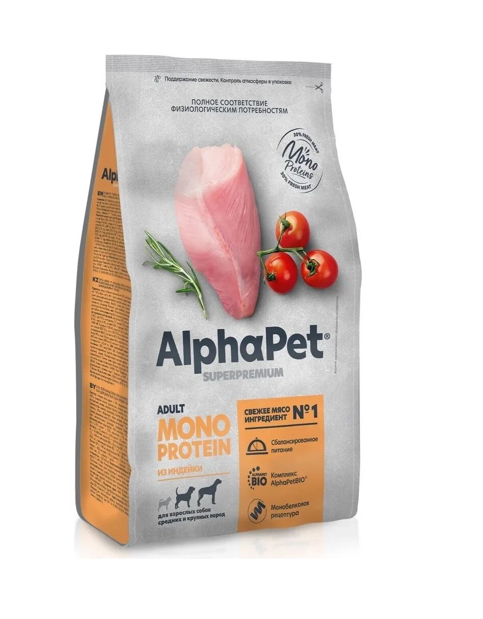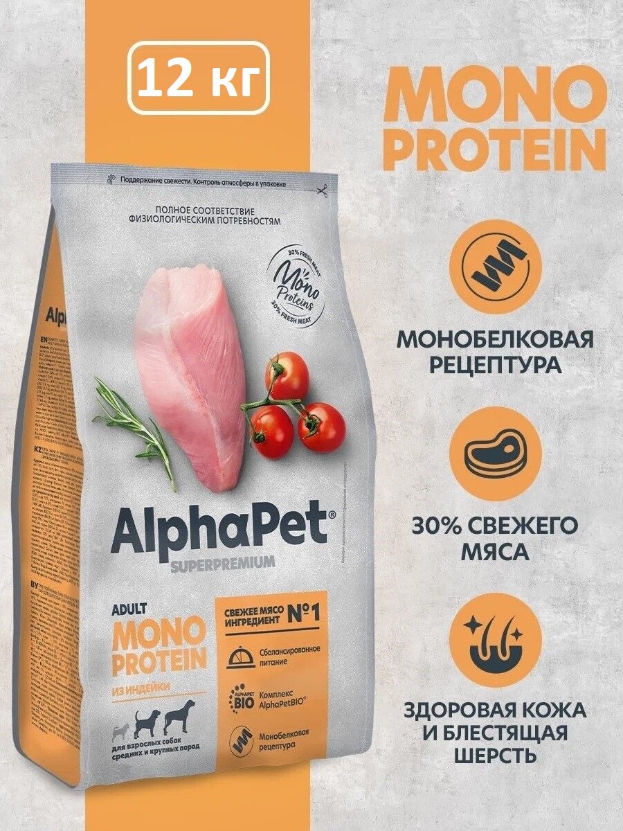Купить Сухой корм ALPHAPET SUPERPREMIUM MONOPROTEIN монобелковый для взрослых собак средних и крупных пород с индейкой (12 кг)