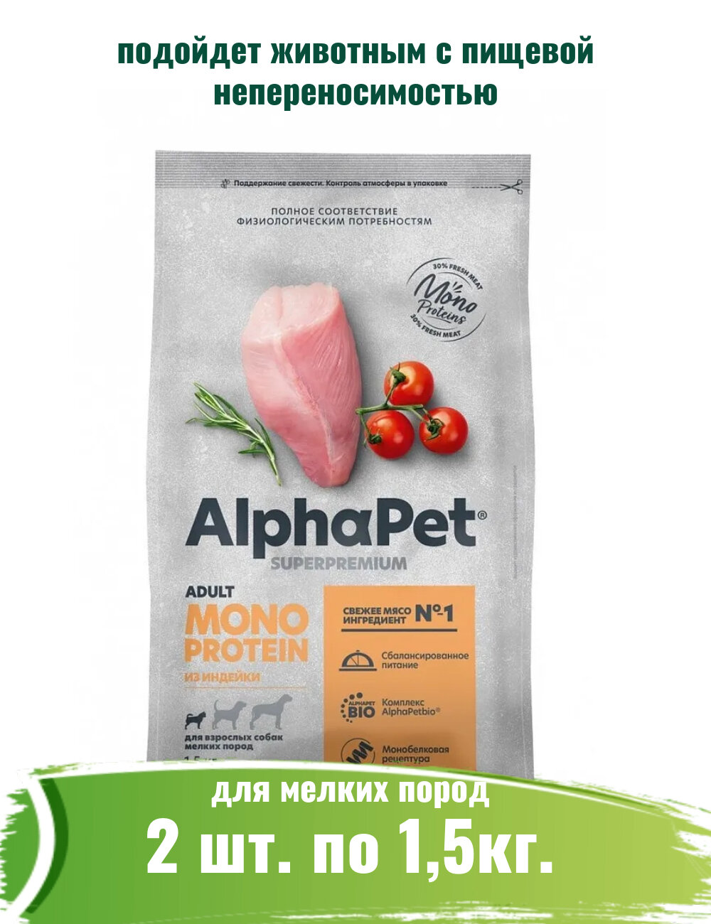 Купить AlphaPet 2шт по 1,5кг Monoprotein корм из индейки для взрослых собак мелких пород