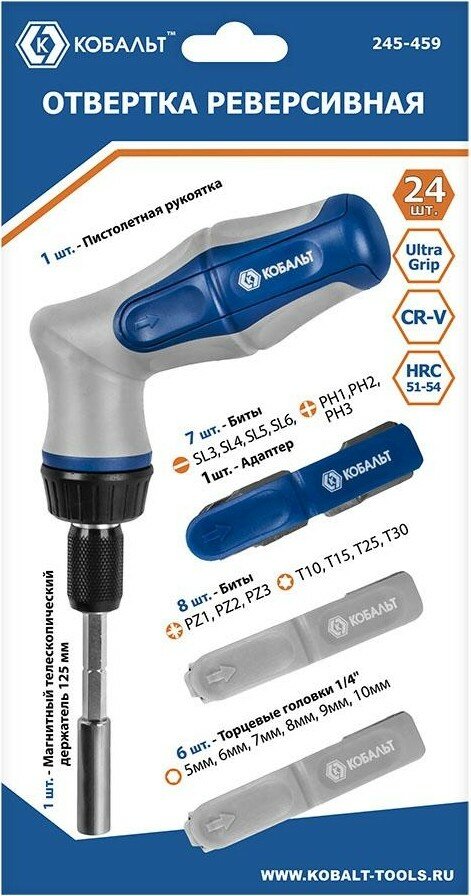 Отвертка реверсивная кобальт Ultra Grip пистолетная, телескопическая,с набором бит и торцевых головок 1/4", CR-V (24 шт.) блистер