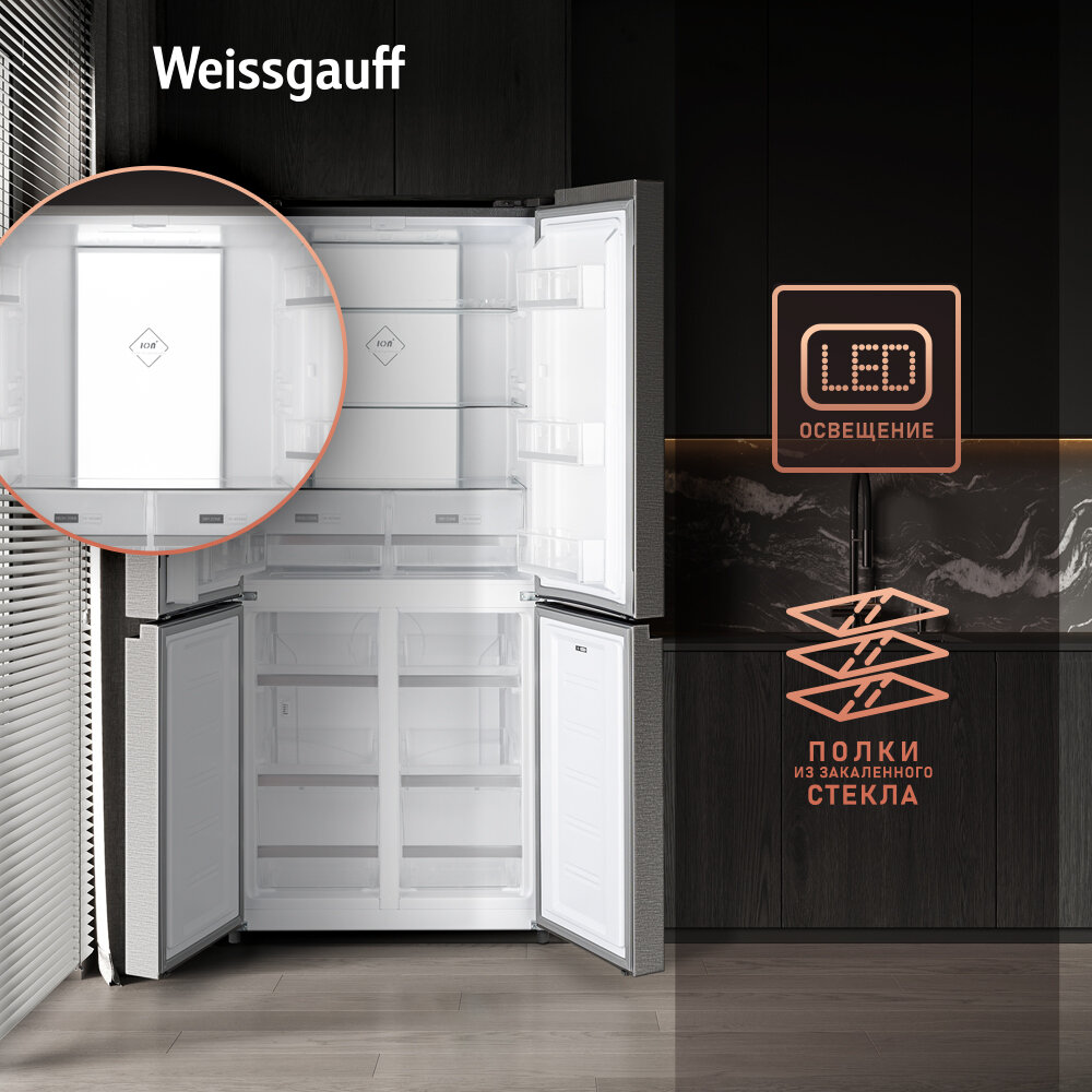 Отдельностоящий холодильник с инвертором Weissgauff WCD 450 X NoFrost Inverter четырехдверный холодильник, 3 года гарантии, система ионизации воздуха, большой объем, тихий режим, Зона свежести с контролем уровня влажности, LED-освещение