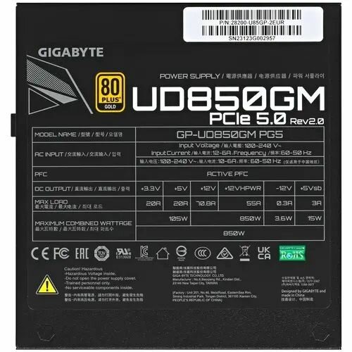 Блок питания Gigabyte Ud850gm PG5 Gp-ud850gm PG5 850W, 80Plus, Gold, Полностью модульный, PCIe Gen 5 .