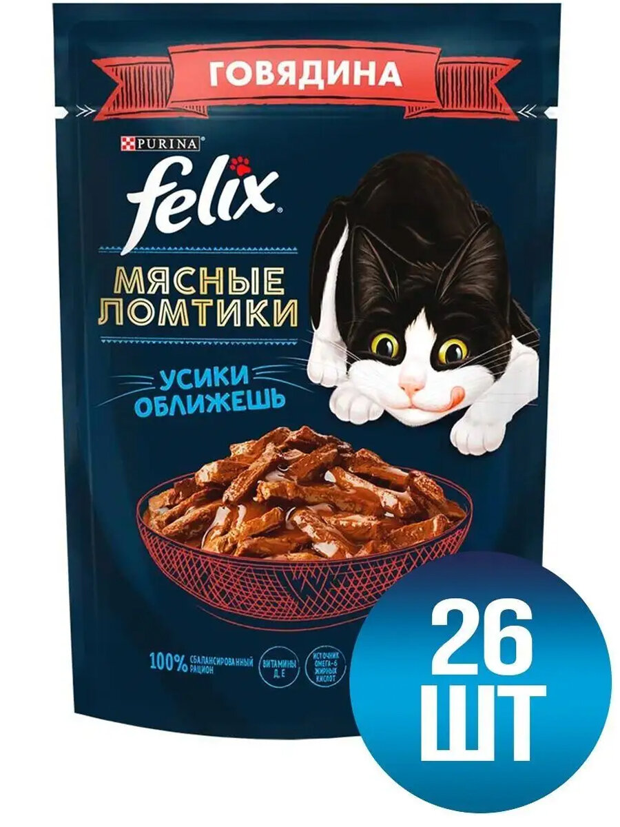 Влажный корм для кошек Felix Мясные ломтики Усики оближешь с говядиной 26 шт. х 75 г (кусочки в соусе)