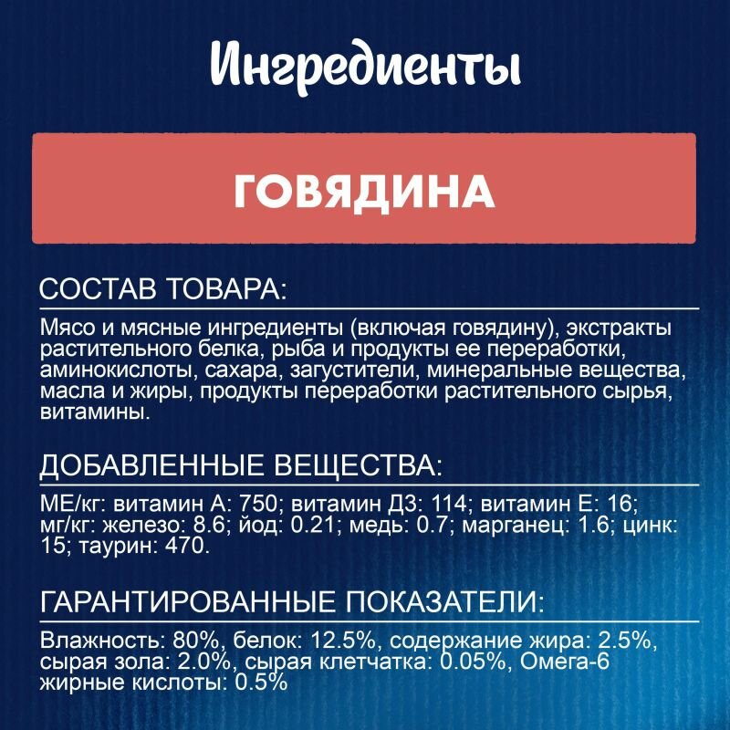 | Состав | мясо и мясные ингредиенты (включая говядину), экстракты растительного белка, рыба и продукты ее переработки, аминокислоты, сахара, загустители, минеральные вещества, масла и жиры, продукты переработки растительного сырья, витамины |