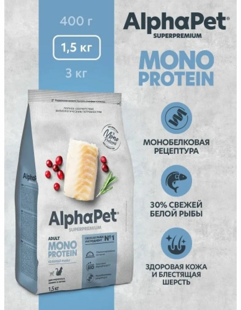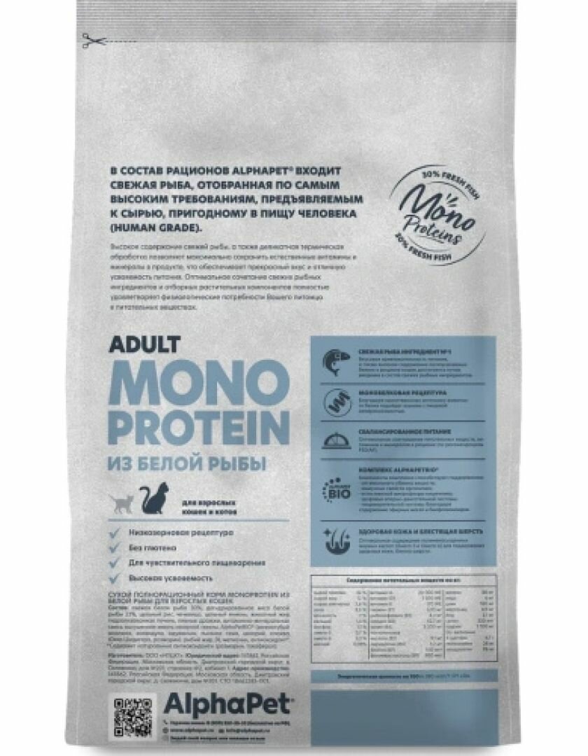 Сухой полнорационный корм MONOPROTEIN из белой рыбы для взрослых кошек AlphaPet Superpremium 1,5 кг