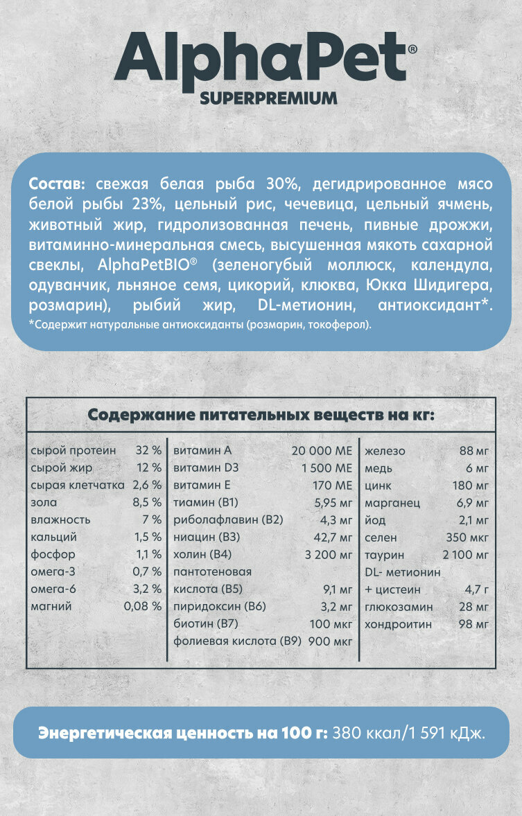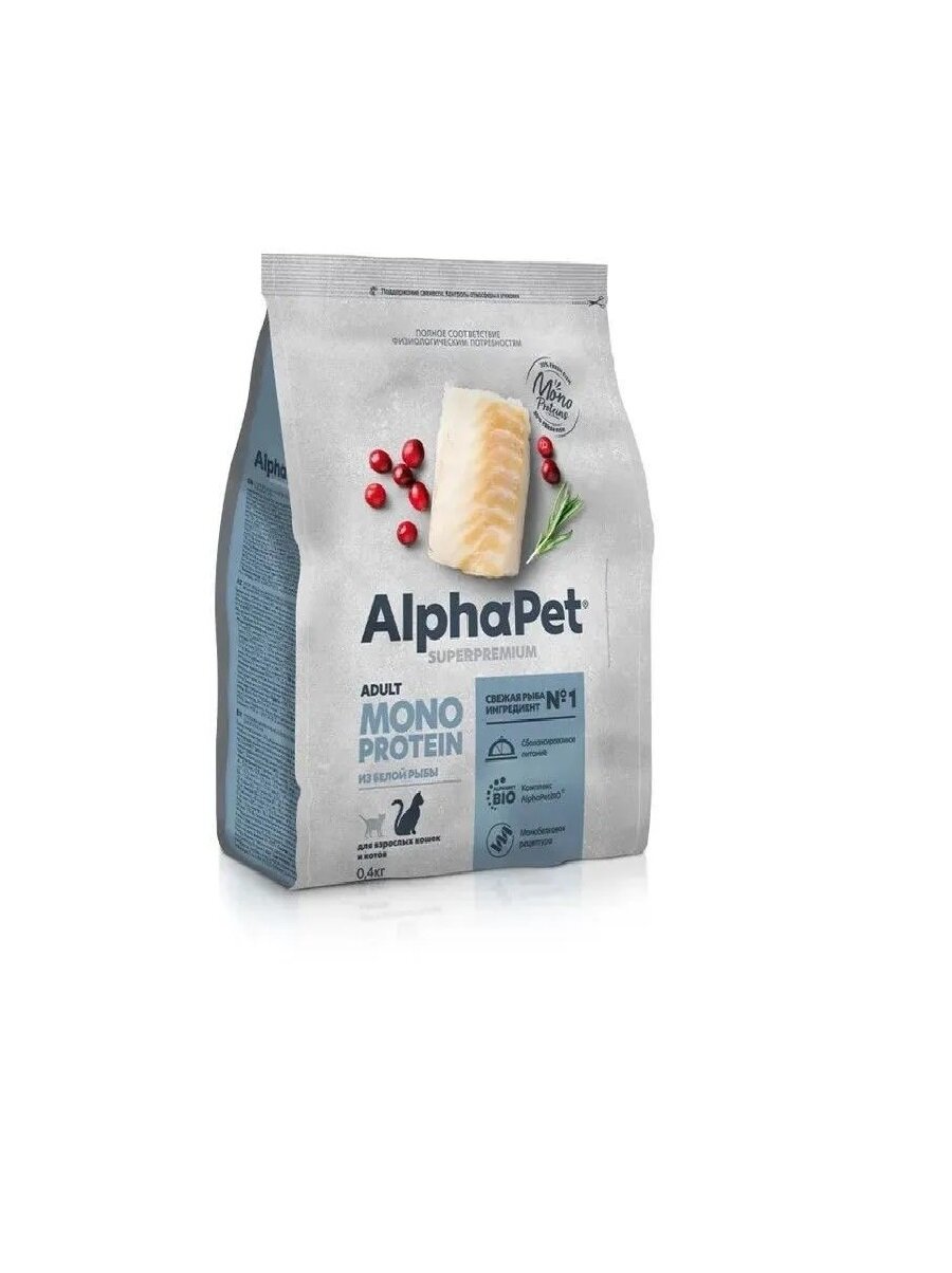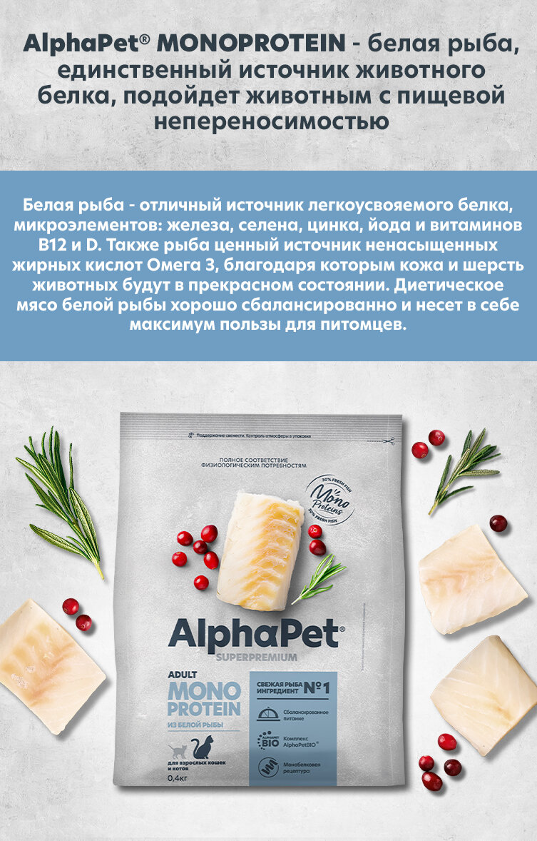 AlphaPet MONOPROTEIN сухой корм для кошек, из Белой рыбы 400г