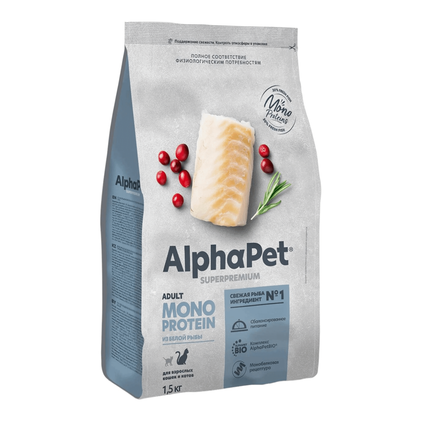Купить ALPHAPET SUPERPREMIUM MONOPROTEIN 1,5 кг сухой корм для взрослых кошек из белой рыбы 1 шт