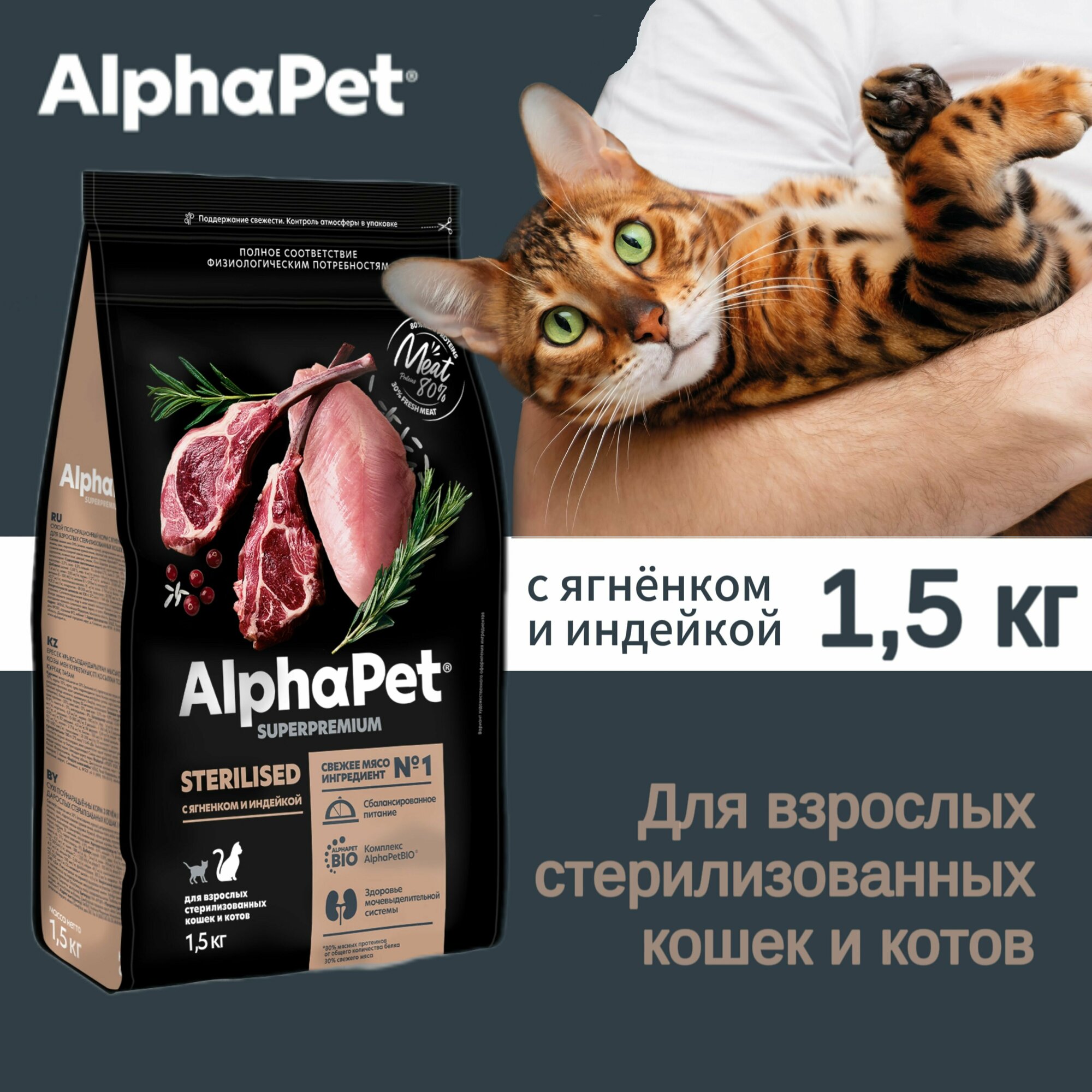 Сухой полнорационный корм AlphaPet (АльфаПет) Superpremium для взрослых стерилизованных кошек и котов, с ягненком и индейкой, 1,5 кг