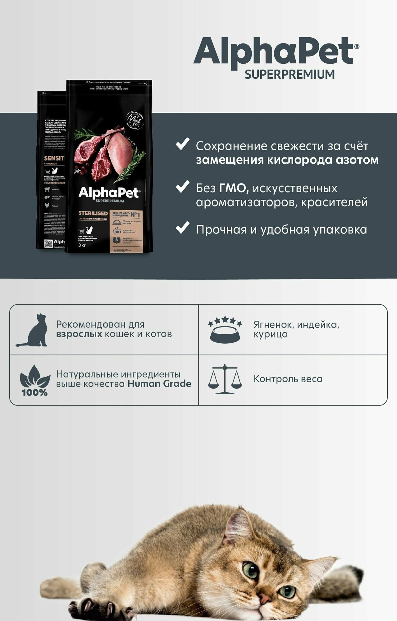 Сухой корм AlphaPet Superpremium стерилизованных кошек, полнорационный, с ягненком и индейкой, 3 кг
