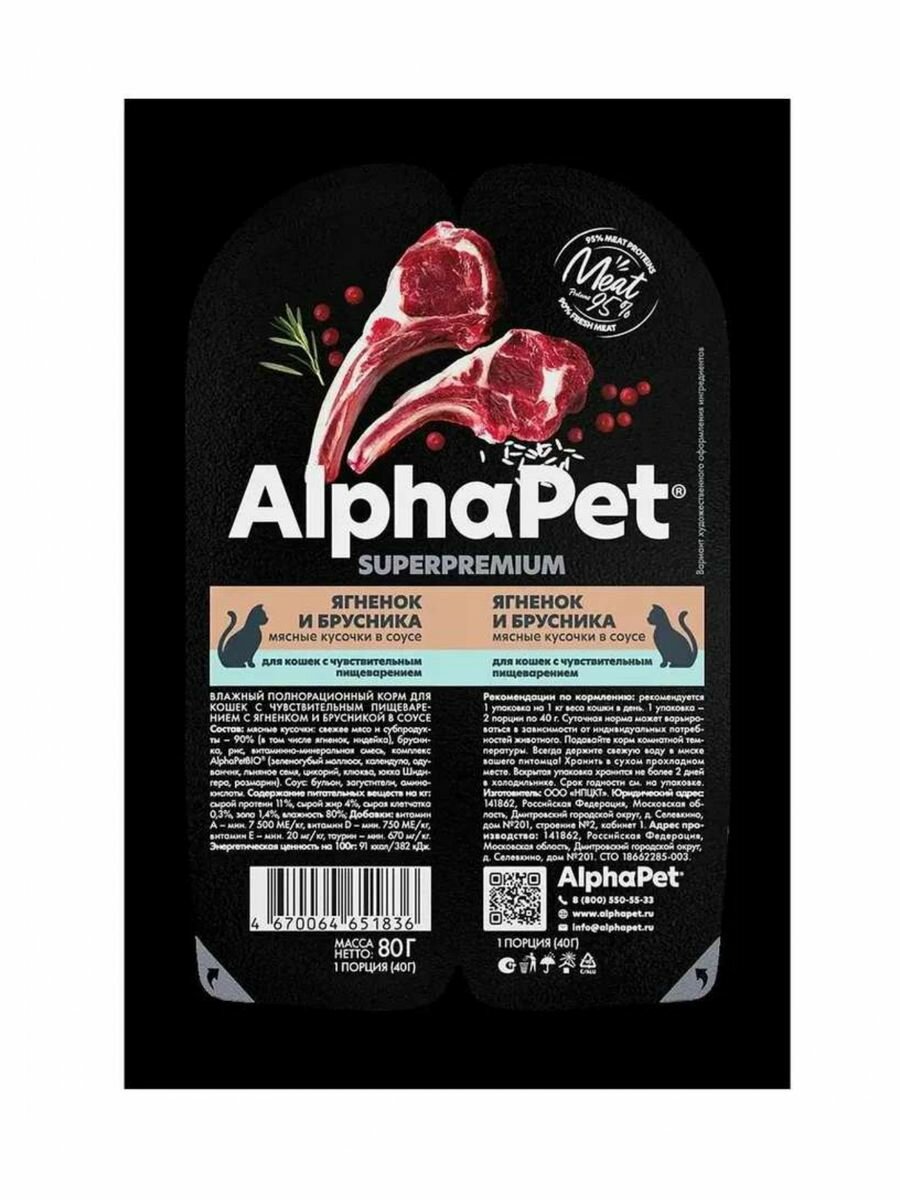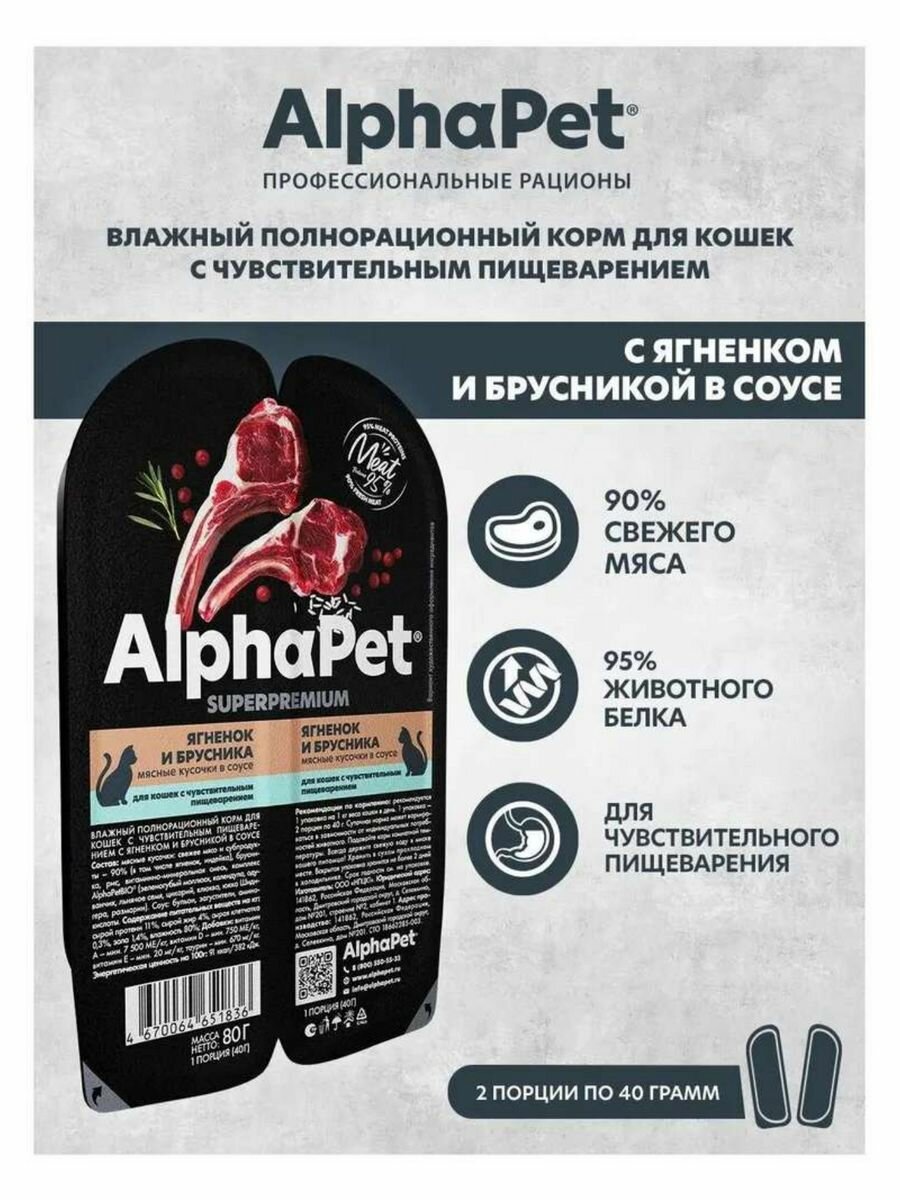 Купить Влажный корм для кошек AlphaPet Superpremium ягненок и брусника в соусе,упаковка 15 шт х 80 гр