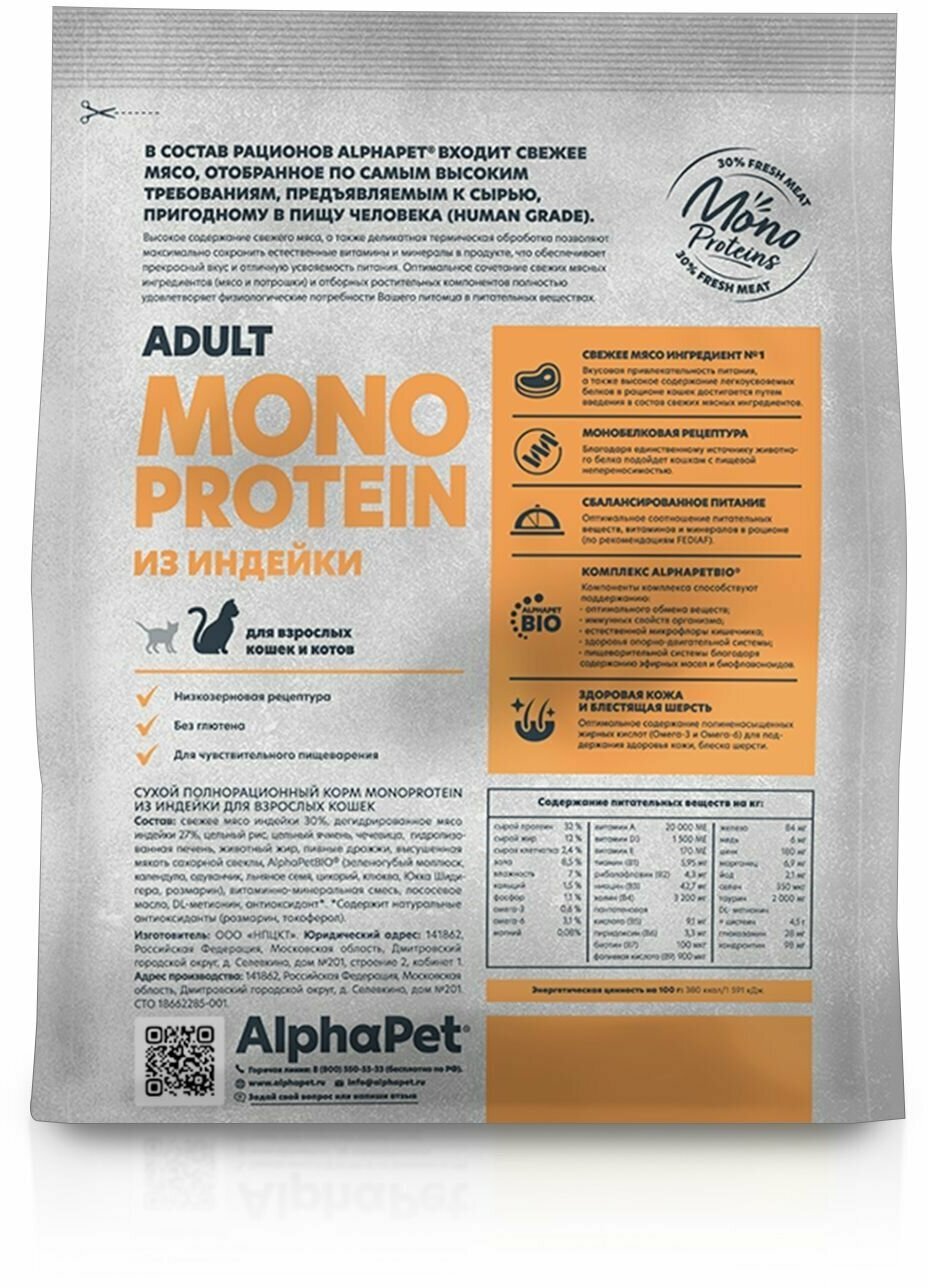 Сухой полнорационный корм MONOPROTEIN из индейки для взрослых кошек AlphaPet Superpremium 0,4 кг