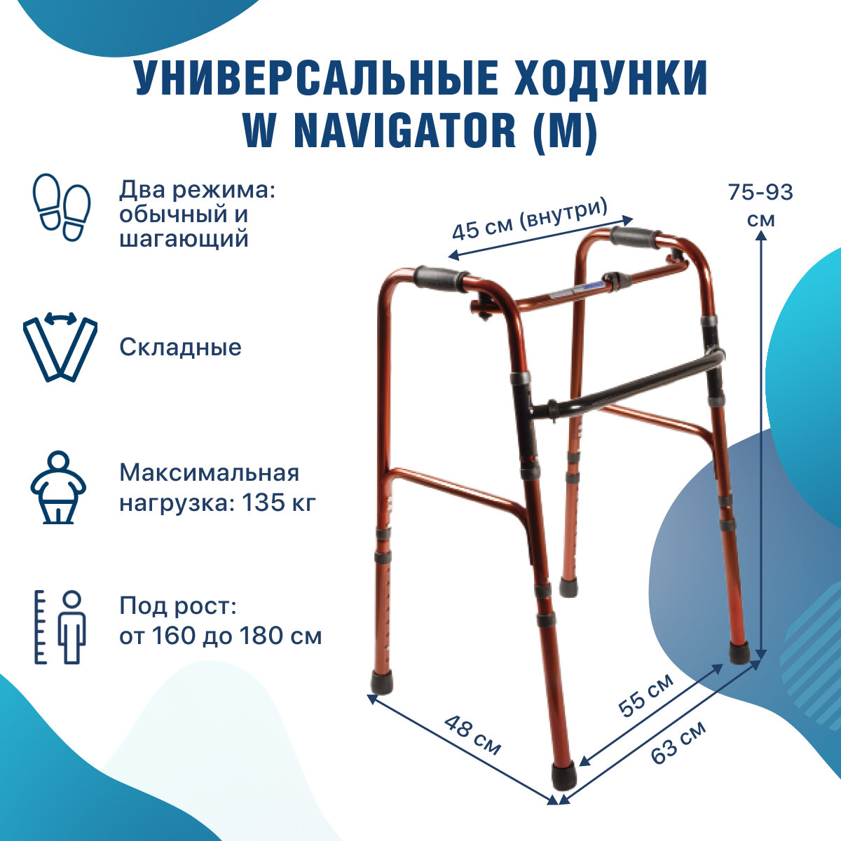 Опоры-ходунки W Navigator (М) складные медицинские для взрослых, пожилых и инвалидов под рост 155-180 см Ходули Barry с шагом/без шага