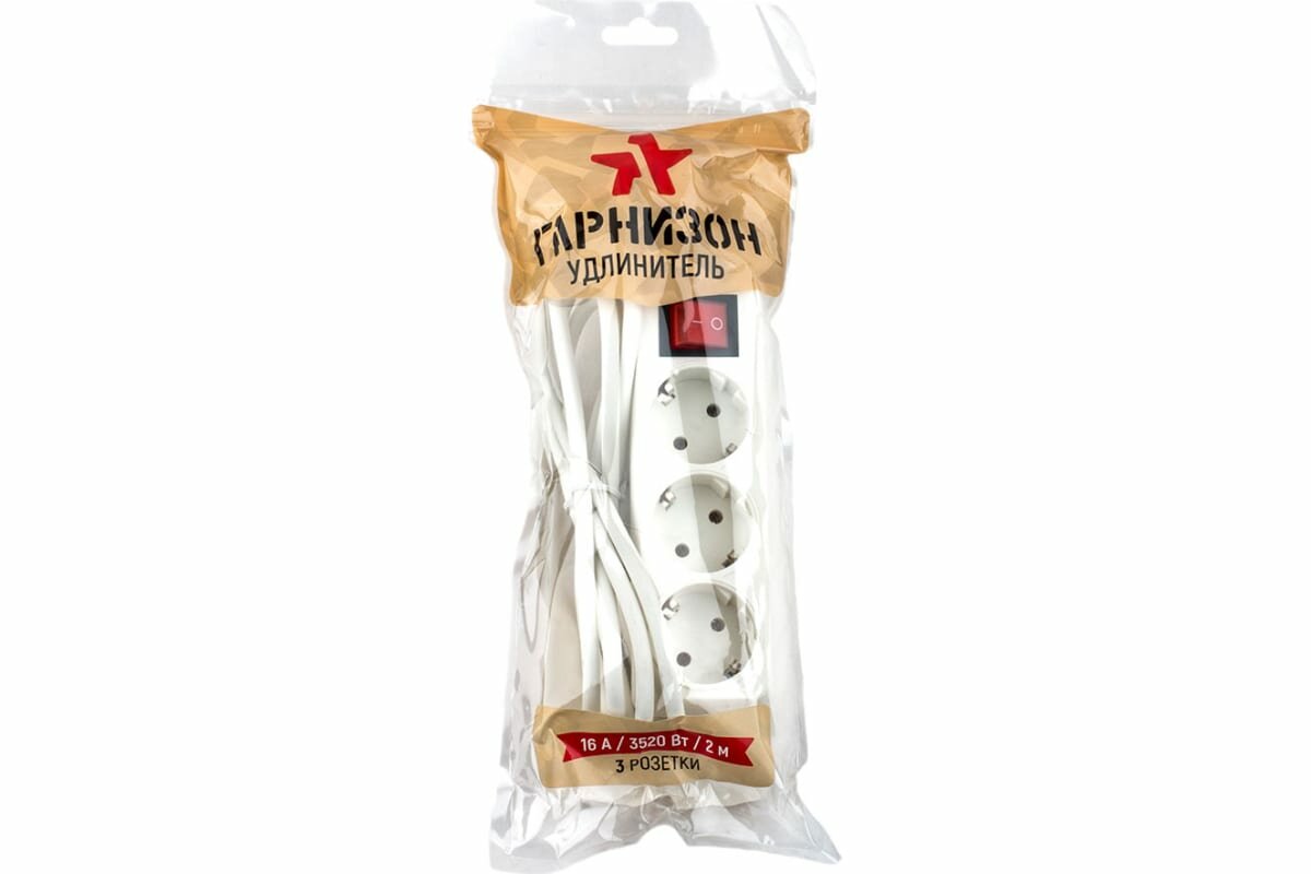 Удлинитель Гарнизон ELB-G3-W-2, 3 евророзетки с выключателем и заземлением, допустимый ток 16 А, длина 2 м