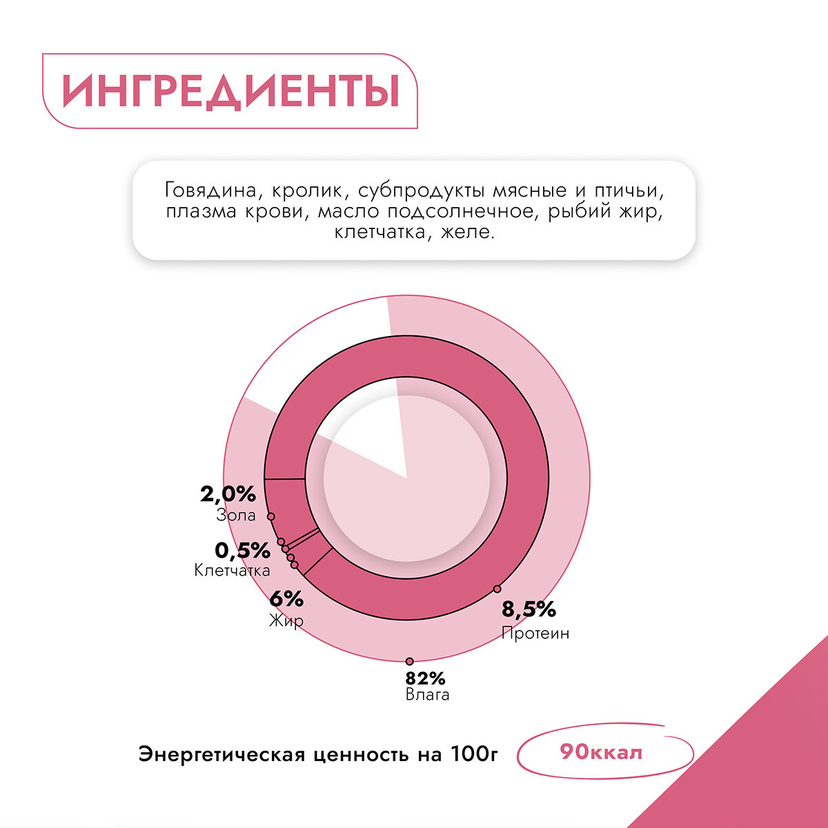 | Состав | телятина, субпродукты мясные и птичьи, плазма крови, морковь, масло подсолнечное, рыбий жир, клетчатка, желе телятина, субпродукты, морковь, лук, желирующая добавка, растительное масло, злаки, соль, вода |
