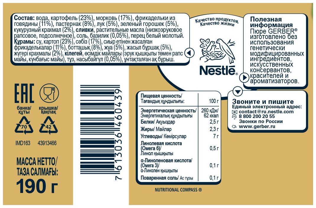 Безумно вкусное и очень полезное пюре Gerber овощи с фрикадельками из говядины. Впервые попробовали с малышом, пришлось бежать за добавкой. Приятно удивил состав, сначала настороженно отнеслась к белому перцу, но прочитав о том что он содержит макро и микро элементы, успокоилась, а уж глядя на то как малыш уплетал в обе щеки это волшебное пюре, Сомнений совсем не осталось в выборе продукта.Удобная баночка. Обязательно попробую другие разновидности этого пюре. Рекомендую сразу брать несколько баночек, чтобы как я не бежать и покупать повторно.