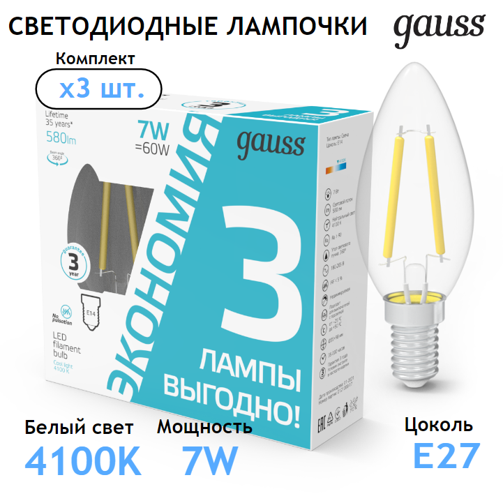 Лампочка светодиодная Е14 Свеча 7W нейтр-белый свет 4100К 580лм (3 лампы в комплекте) Gauss Filament