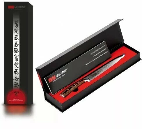 | Дополнительная информация | лезвие изготовлено из сверхтвердой стали VG-10 с обкладками из 67 слоев дамасской стали; рукоять изготовлена из черно-коричневой пакки |