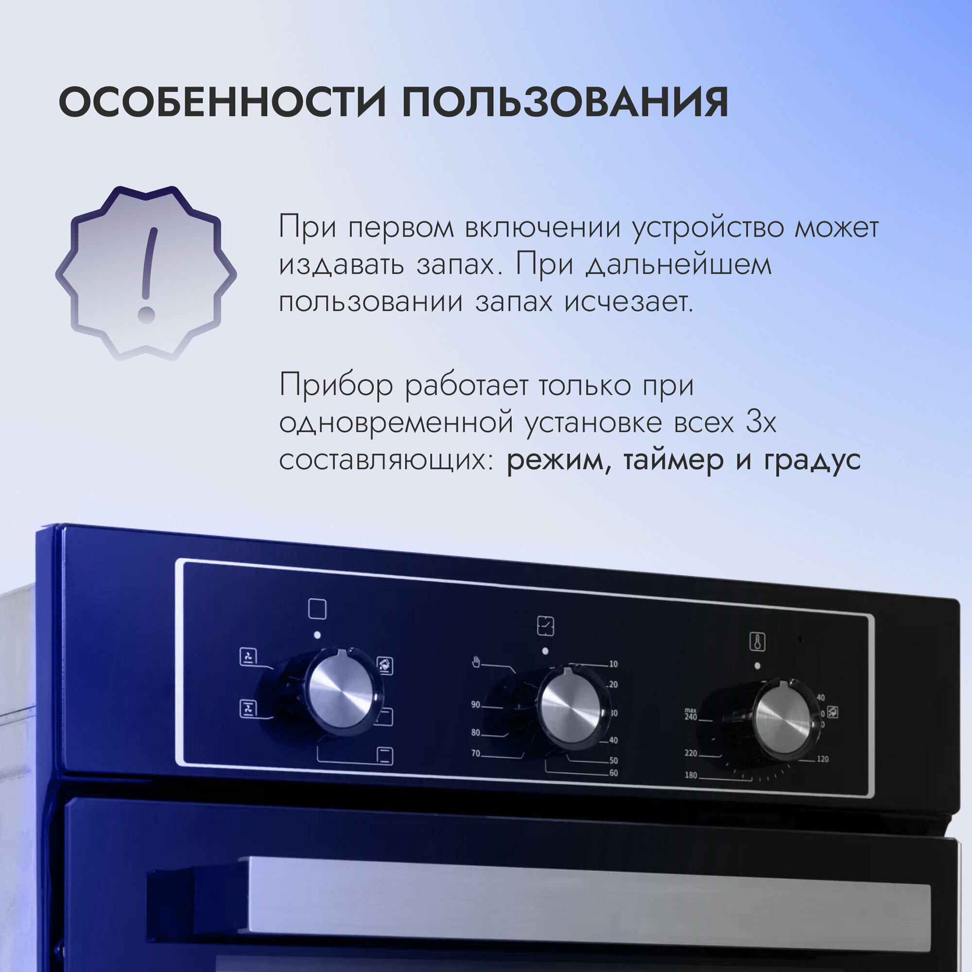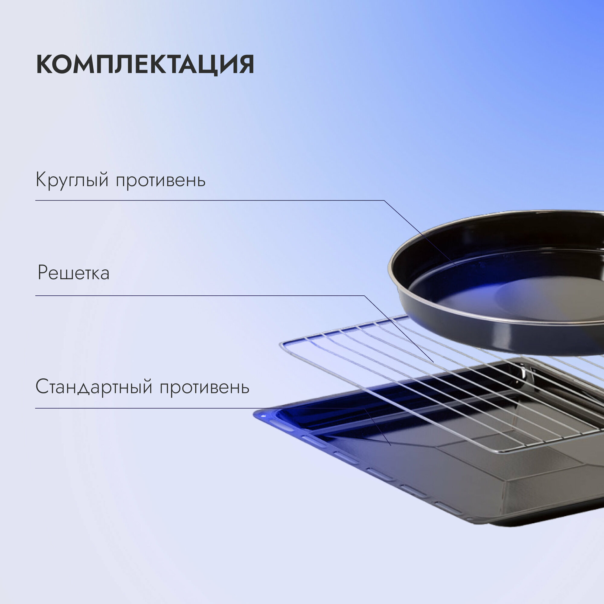 | Подробная комплектация | Духовой шкаф, шнур для подключения, инструкция, стандартный противень, круглый противень, хромированная решетка |