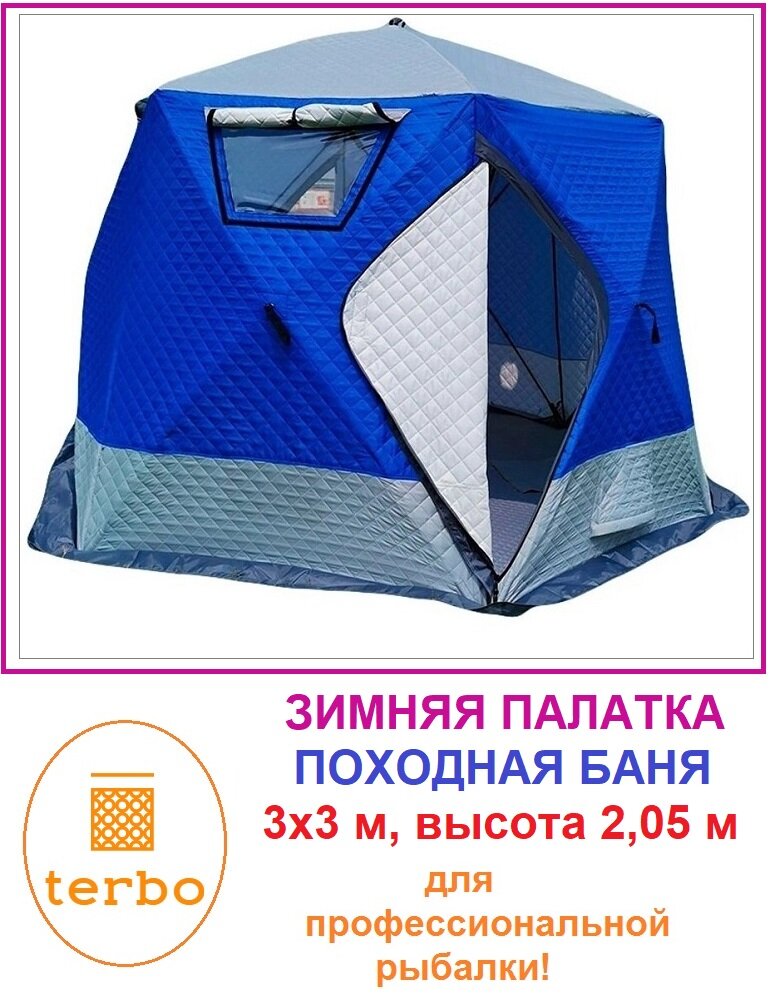 Утепленная зимняя палатка для рыбалки Terbo Mir Куб 2, шестисторонняя, 3 слоя, размеры 3х3х2,05 м, цвет сине-белый