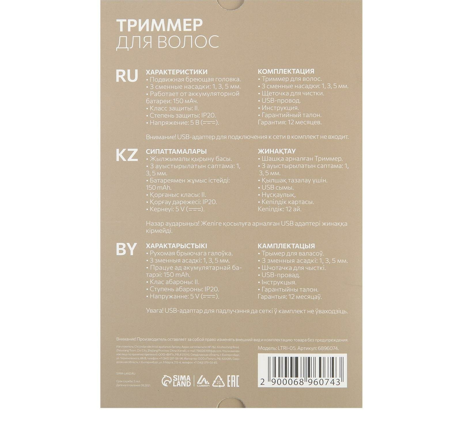| Дополнительная информация | триммер для волос; 3 насадки: 1, 3, 5 мм; щёточка для чистки; USB-провод; документация. |