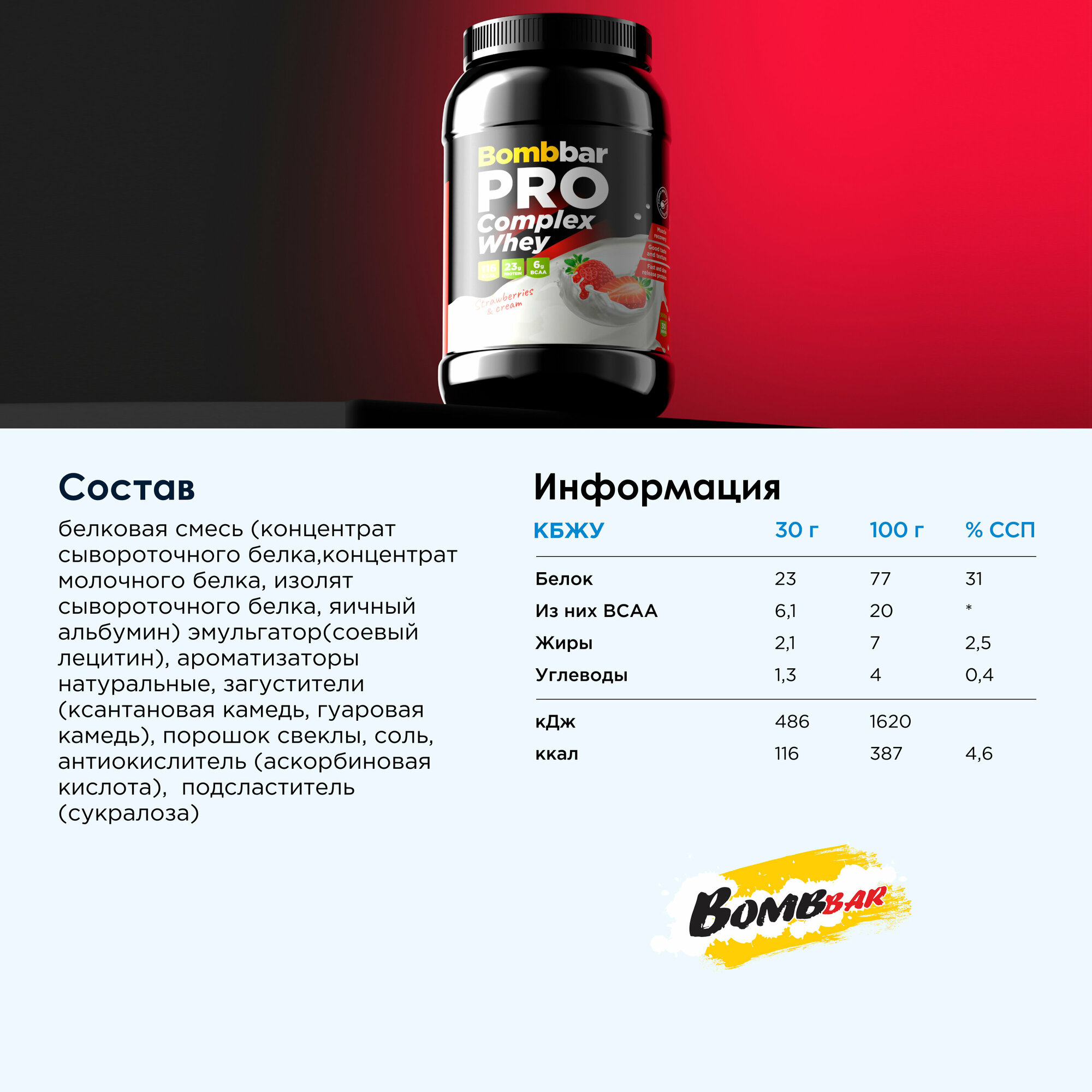 Купить Bombbar Pro Complex Whey Многокомпонентный протеин "Клубника", 900г