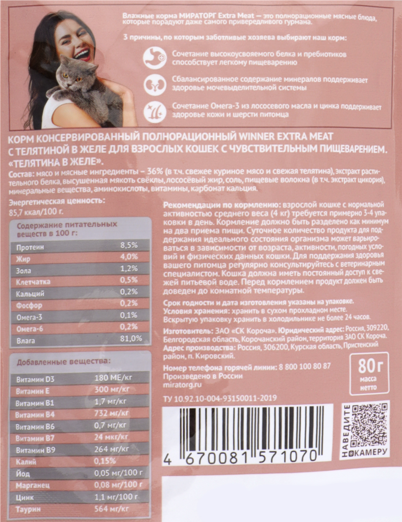 Корм влажный Мираторг Winner Extra Meat для взрослых кошек с чувствительным пищеварением, телятина в желе, 80 г