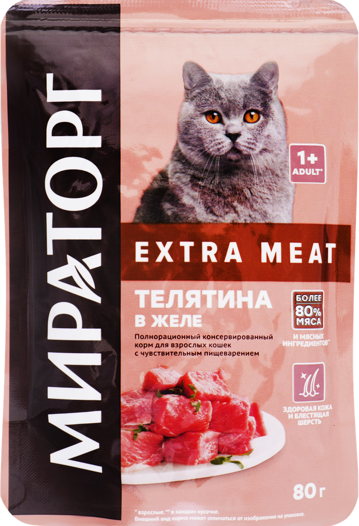 Влажный корм для кошек Мираторг Extra Meat, при чувствительном пищеварении, с телятиной 80 г (кусочки в желе)