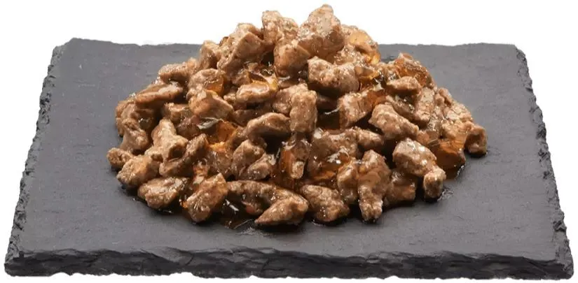 | Состав | мясные кусочки (мясо и субпродукты (в том числе курица более 60% и говядина), минеральные вещества, витамины, мякоть сахарной свеклы, таурин) и желе (вода, аминокислоты, загустители, сахара |