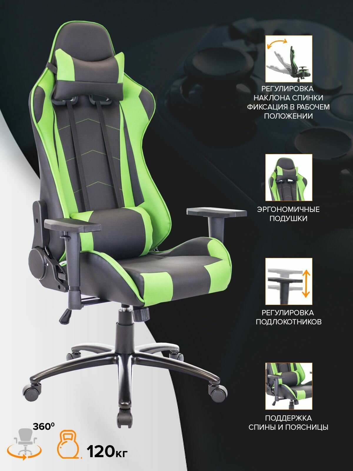 Игровое компьютерное кресло Everprof Lotus S9 эргономичное геймерское, черно-зеленое / съемный подголовник, поясничная поддержка, регулировка высоты газлифт / экокожа, крестовина сталь