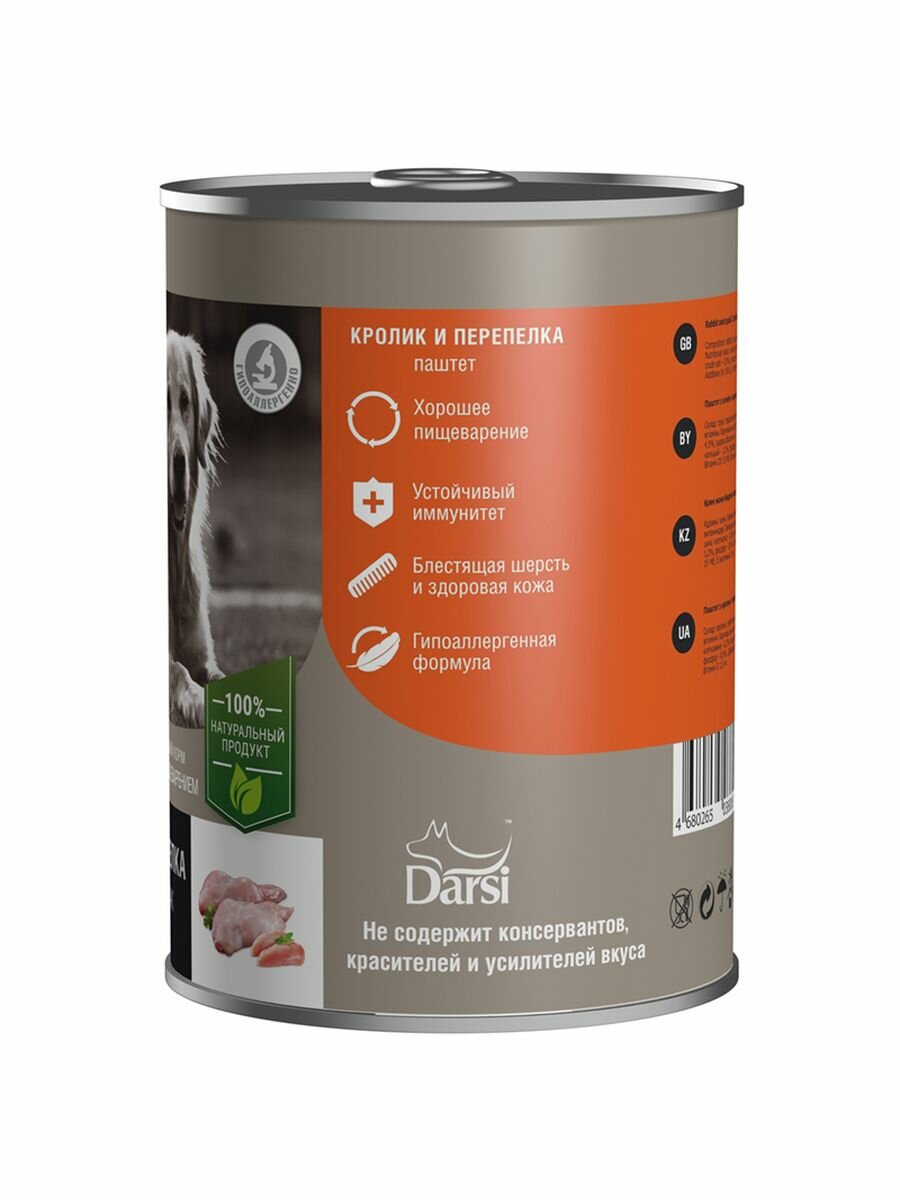 Darsi Консервы (паштет) для собак чувствительным пищеварением "Кролик и Перепелка", 410г, 12 штук