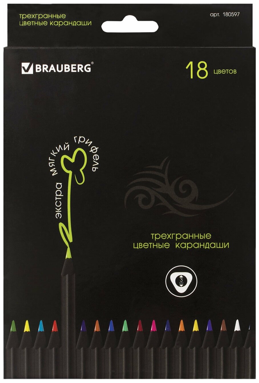 Карандаши цветные Brauberg "Black Jack", 18 цветов, трехгранные, черное дерево (180597)