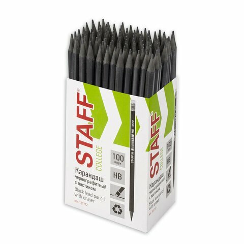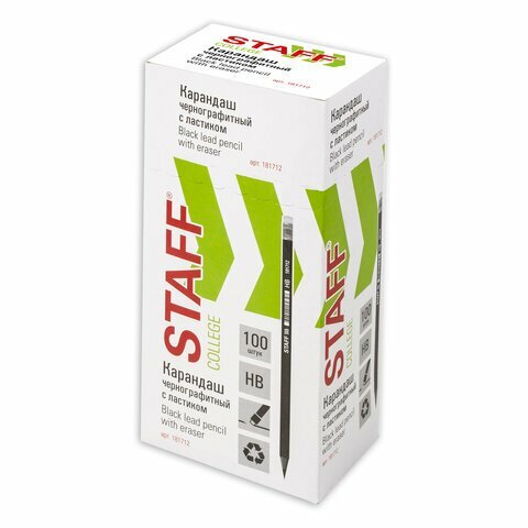 Карандаш чернографитный STAFF "College" BLP-712, 1 шт., НВ, с ластиком, пластик, корпус черный, 181712, 100 штук