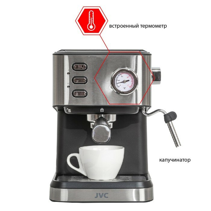 Кофеварка рожковая JVC со съемным резервуаром 1,5 л, двойным фильтром, подогревом чашек, 1050 Вт