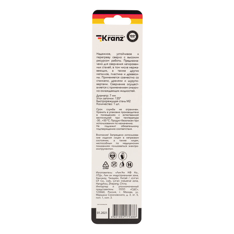 Сверло по металлу KRANZ 7 мм Стандарт+ из быстрорежущей стали P6M5 M-2, в упаковке 1 шт., стандарт DIN 338