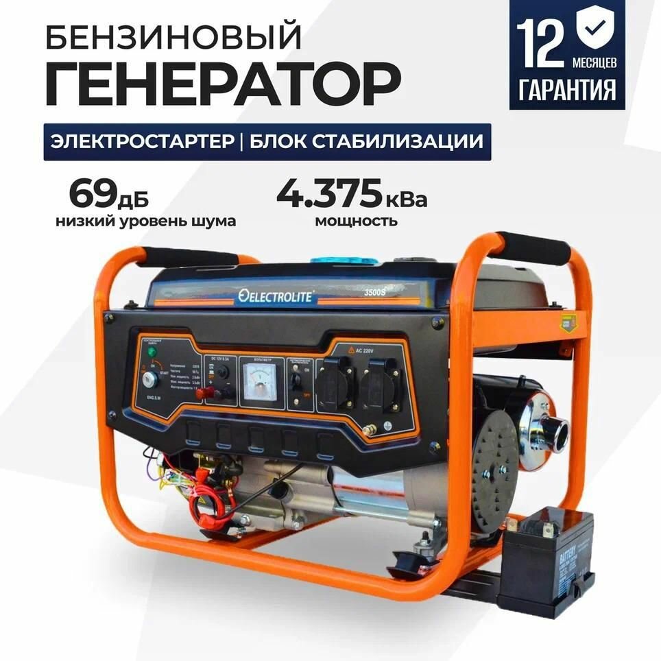 Генератор Бензиновый / Электрогенератор ELECTROLITE 3500S ( электростартер 3,75 кВа - 4,4 кВа, 7.5 Л.С, 220/12 В, медь )