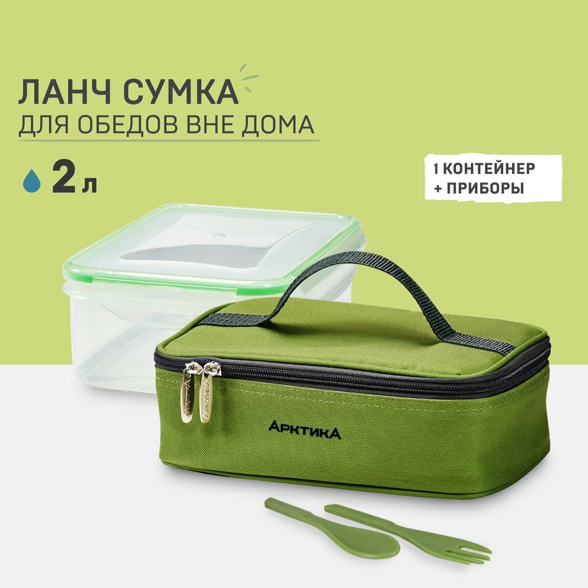 Ланч-сумка с контейнером и приборами Арктика 020-2000-2, зелёная, 2 л