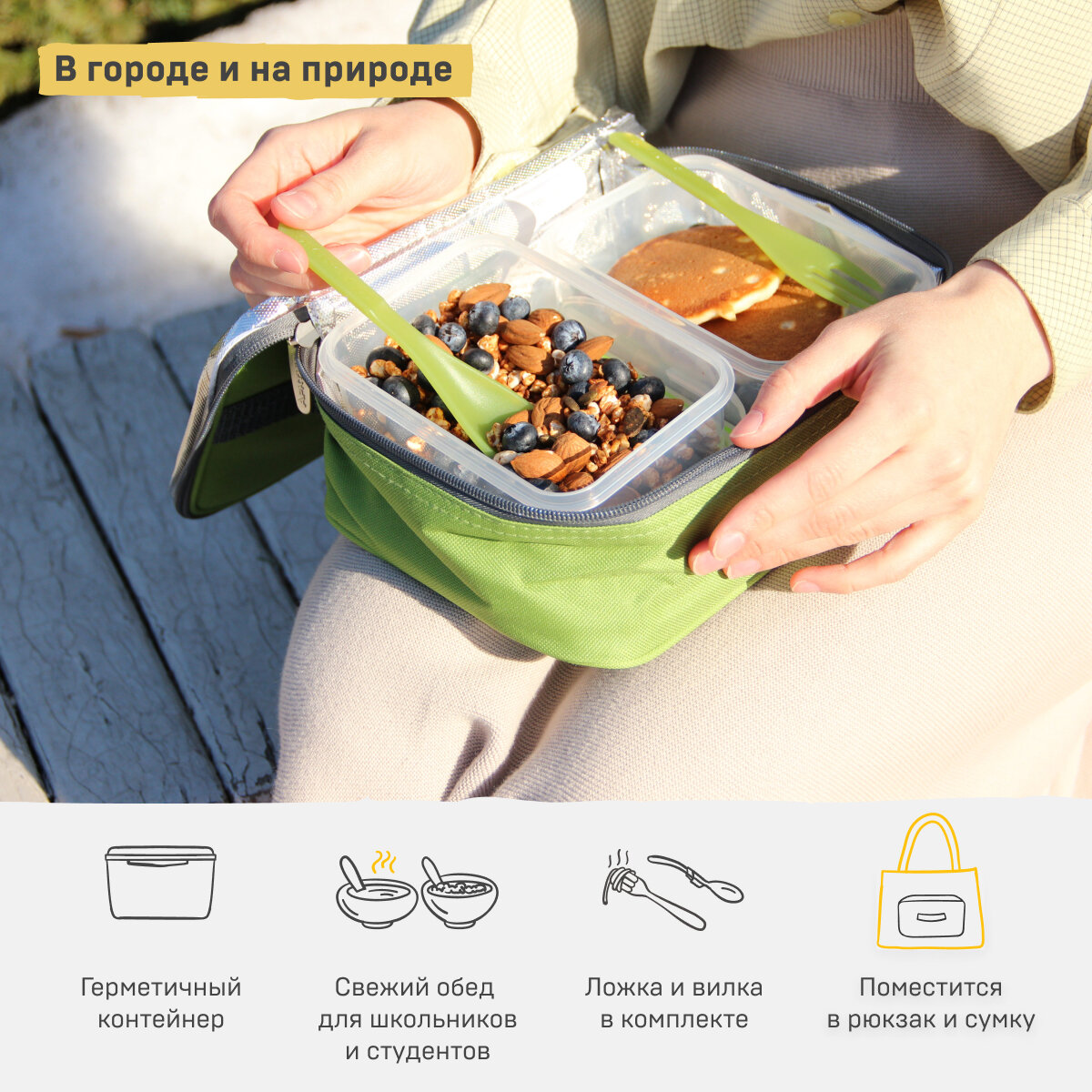 Ланч-сумка с контейнером и приборами арктика , 2 л, 020-2000-2, зелёная