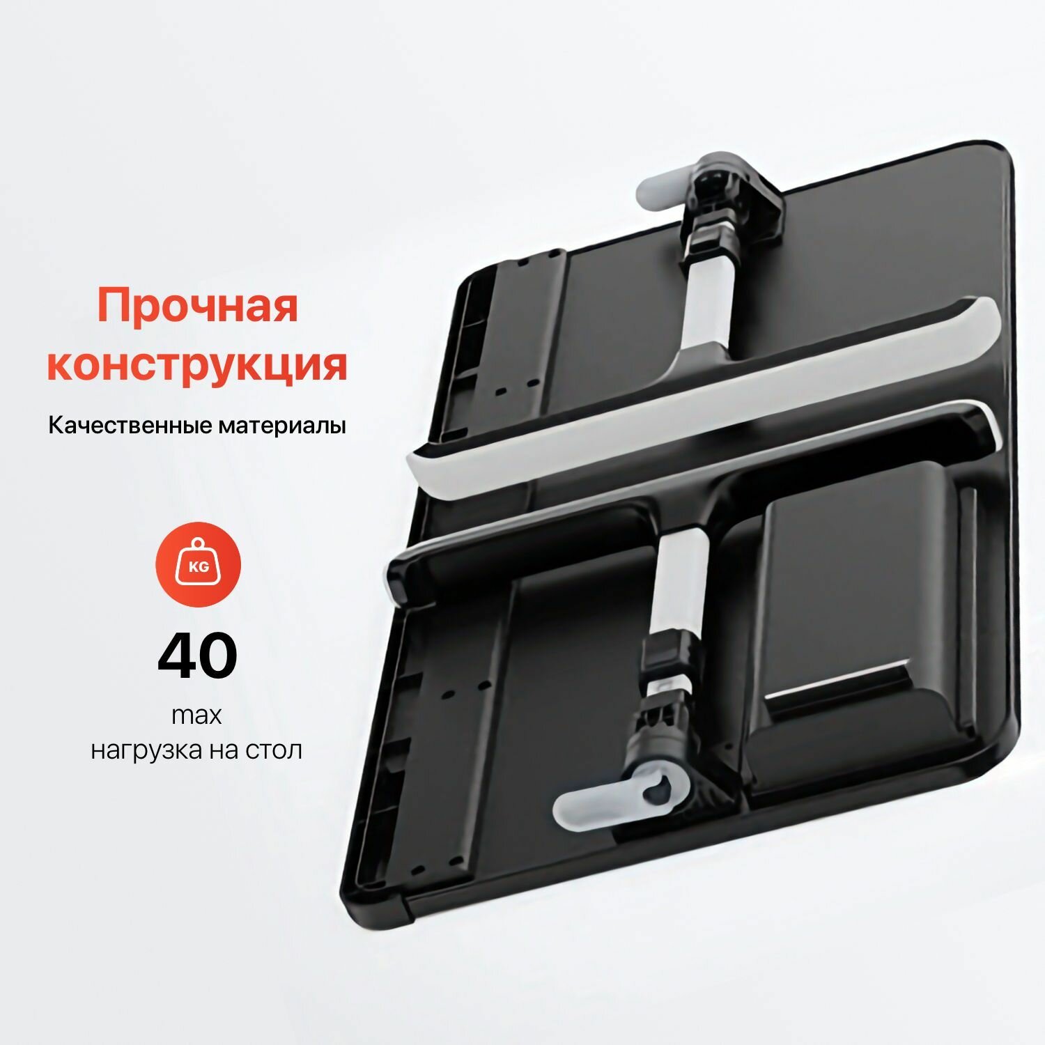 Очень основательный столик, все крепления и регулировки надежные, не хлипкие, как у других. И главное, ширина столика позволяет поставить не только ноутбук с мышкой, но и при желании стандартную клавиатуру и мышь.