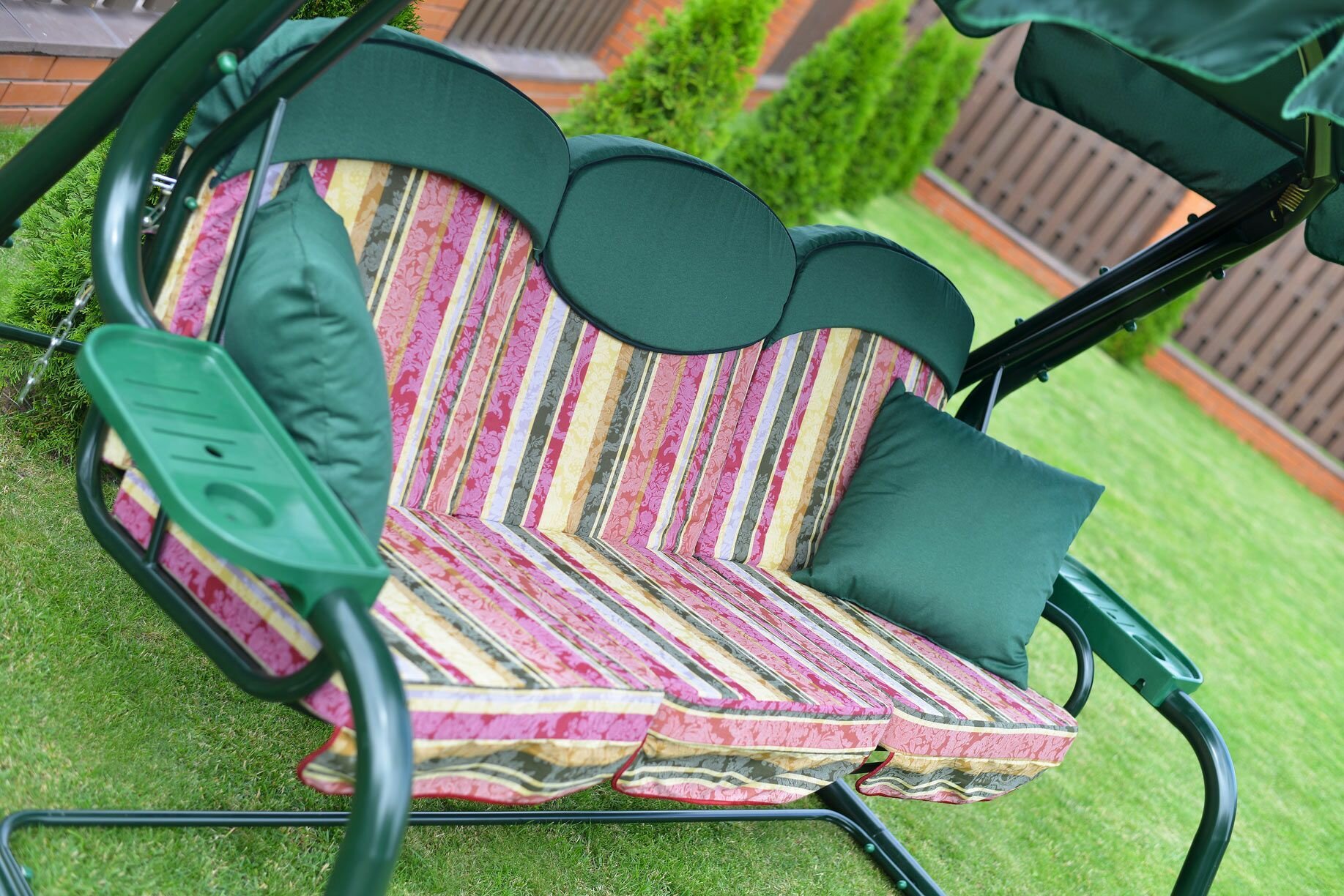 Качели садовые 3-х местные Мебельторг Мастак Каркас зеленый/Разноцветный рис.полоска