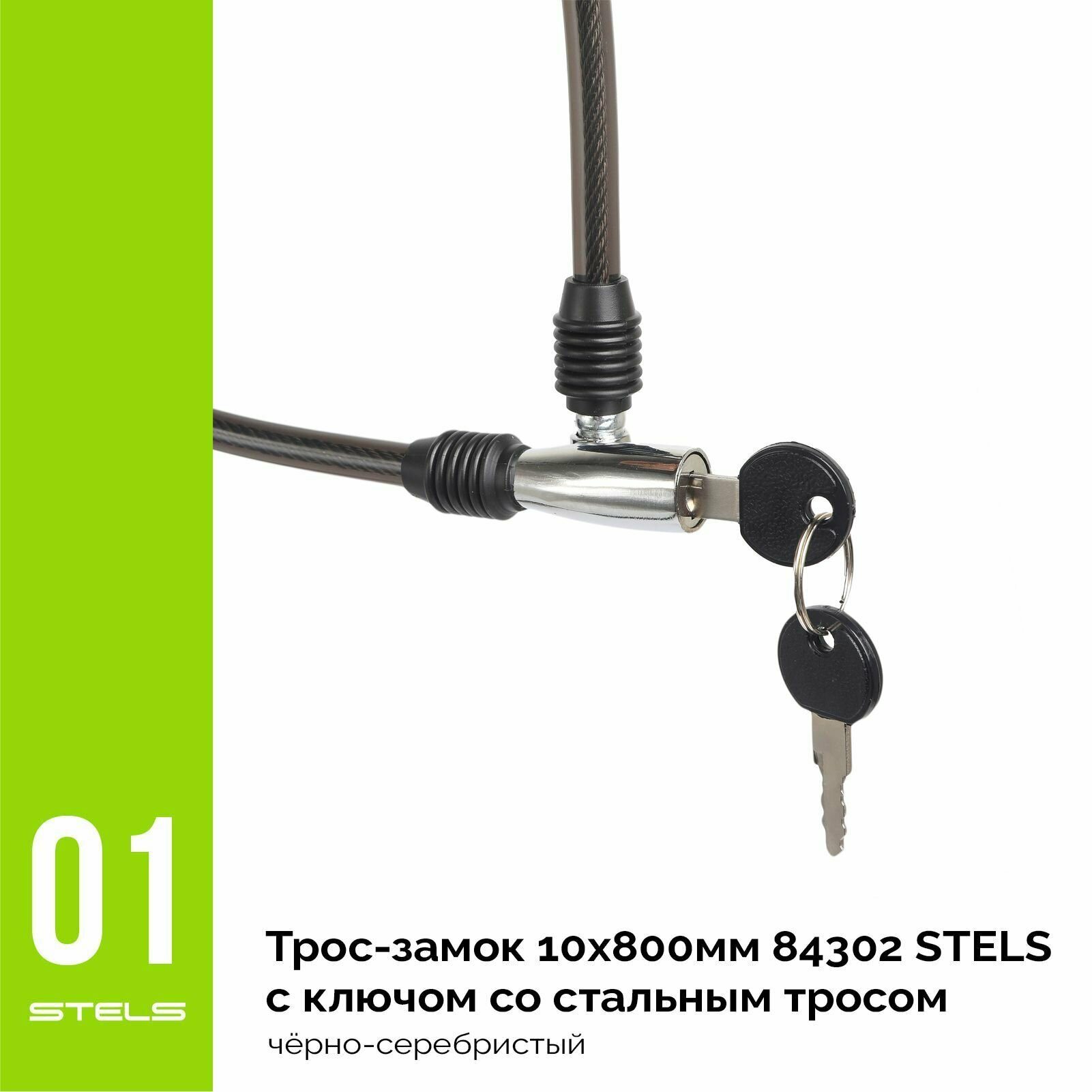 Замок для велосипеда 10х800мм STELS 84302 с ключом со стальным тросом, чёрно-серебристый NEW