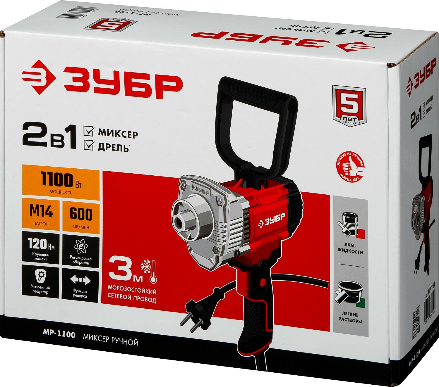 Строительный миксер Зубр МР-1100 строительный, 1100 Вт