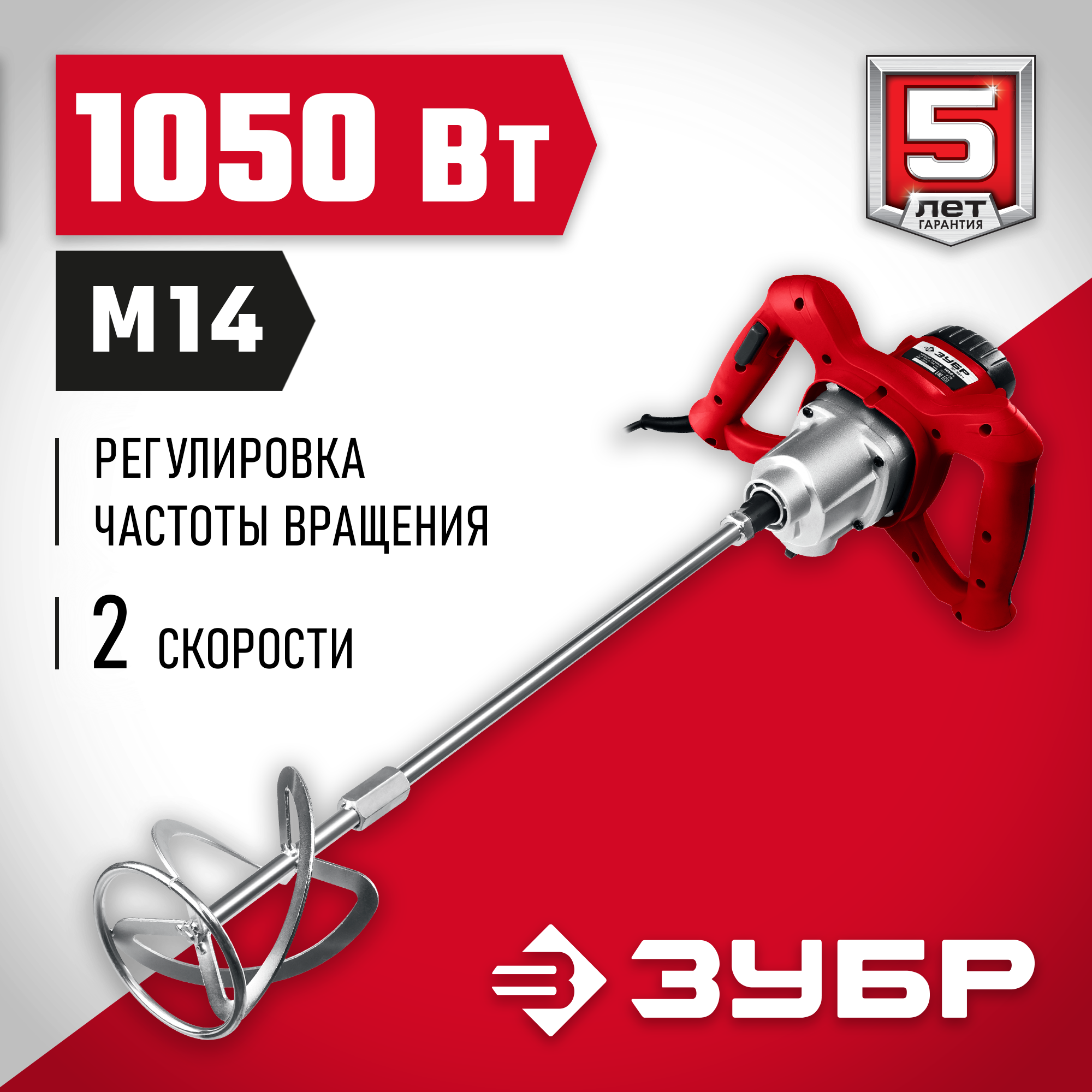 Миксер ЗУБР МР-1050-1 строительный, 2-скоростной,1050Вт, 0-500/0-700 об/мин, М14 патрон, перемешивание "вверх/вниз"